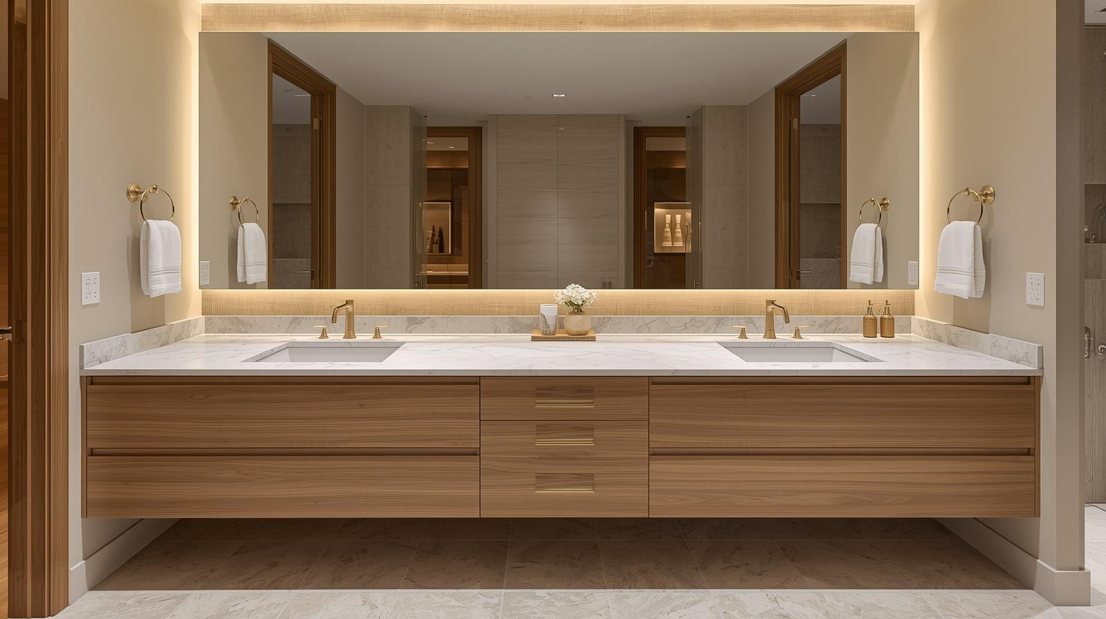 A double vanity is the single most practical and transformative upgrade available to the master bathroom, eliminating the daily friction of shared sink space while simultaneously creating a symmetrical composition of considerable architectural elegance. Choose a vanity unit in natural oak, painted shaker, or sleek lacquered cabinetry with a generous stone countertop in honed marble, warm travertine, or matte quartz extending well beyond each sink basin on both sides. The additional counter space on either side of the sinks provides genuinely useful surface area for everyday toiletries, morning skincare routines, and personal organisation without visual clutter.