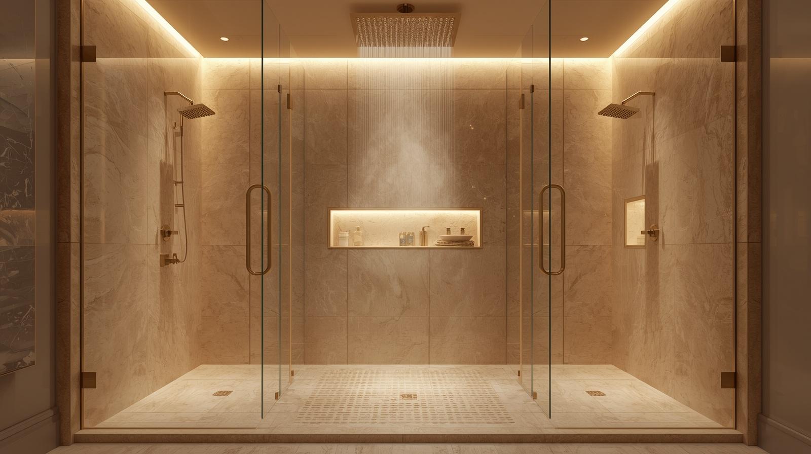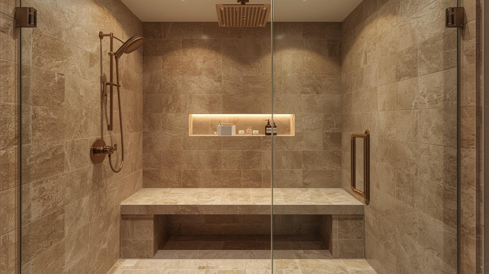 A built in stone or tile bench within the walk in shower enclosure transforms the daily shower from a purely functional standing experience into a genuinely luxurious, spa quality ritual that accommodates both practical needs and moments of complete, unhurried relaxation. The bench provides a surface for shaving, foot care, and the placement of shower products while also offering the simple, profound pleasure of sitting beneath a warm rainfall shower head without time pressure or practical constraint. Construct the bench from the same stone or tile as the surrounding shower walls for a seamless, architecturally integrated result.