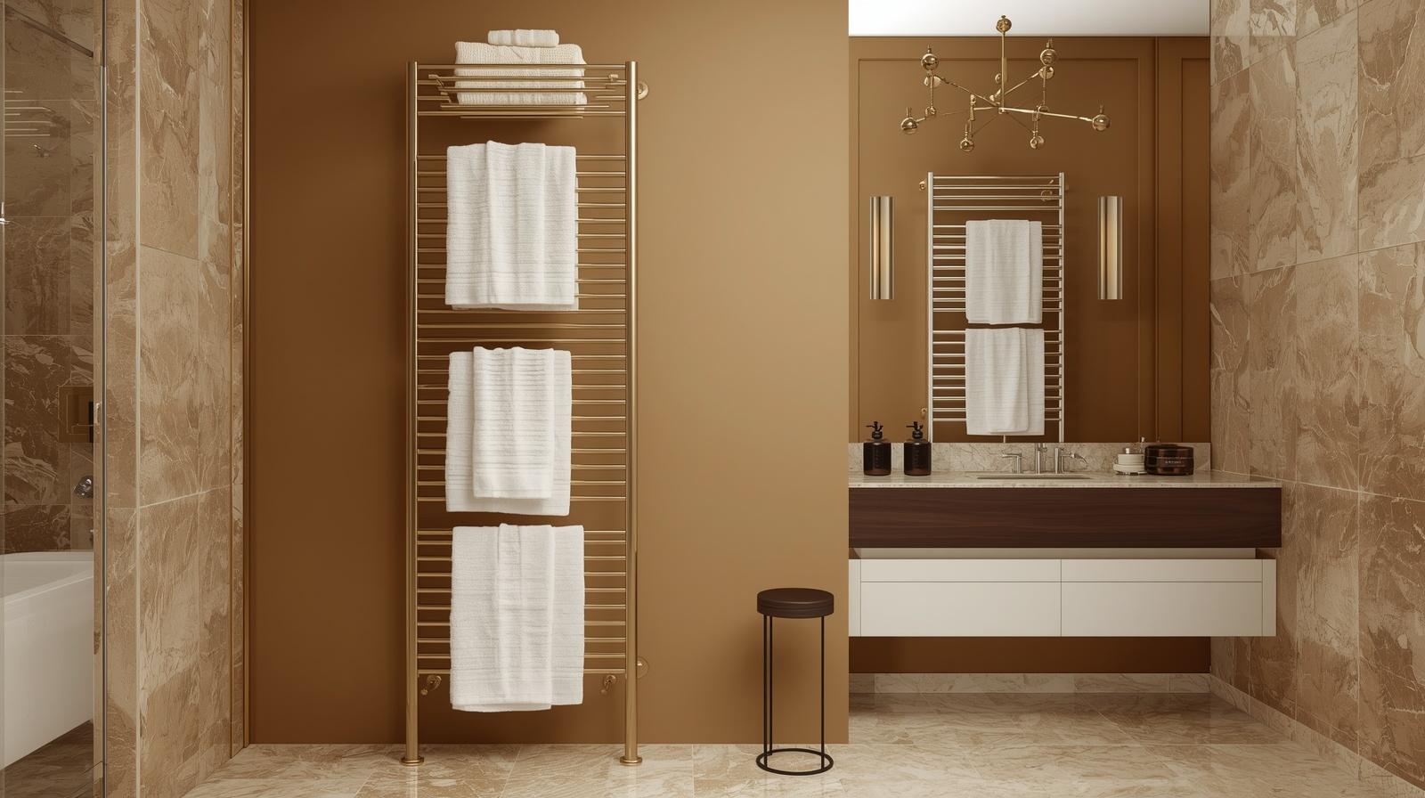 A substantial heated towel rail in brushed brass, matte black, or polished chrome mounted on the master bathroom wall provides both genuine practical comfort and an opportunity for a beautifully styled towel display that adds softness and hotel quality luxury to the space. Choose a rail with multiple bars wide enough to hang four to six full sized towels simultaneously and invest in genuinely beautiful towels in a coordinated palette of warm white, ivory, and soft sand. Fold or drape each towel with considered intention and the rail becomes as much a decorative feature as a practical one.