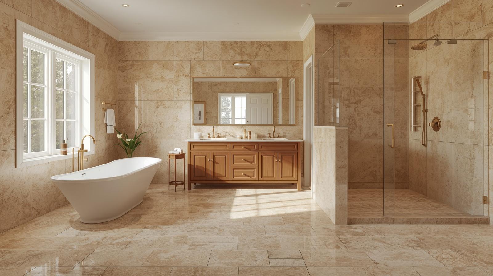 Using a single natural stone tile continuously across both the floor and walls of the master bathroom creates an enveloping material experience of complete, seamless luxury that dissolves the boundaries between surfaces and makes the entire room feel carved from a single living geological material. Choose warm travertine, creamy limestone, or rich veined marble and extend the same tile from the floor up through the shower walls, around the vanity surround, and across the main bathroom walls without interruption. The material continuity creates a visual calm and spatial generosity that feels genuinely and unreservedly magnificent.
