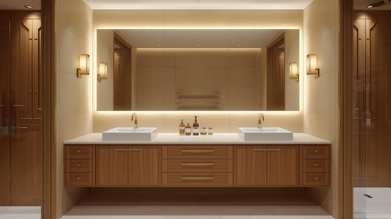 A large format bathroom mirror with integrated backlit LED illumination mounted above the vanity creates a lighting effect of considerable practical flattery and visual sophistication that elevates the morning and evening preparation experience to a genuinely luxurious standard. The soft, even glow of the backlit border diffuses light around the mirror perimeter without harsh shadows or unflattering overhead glare, creating the most flattering and consistent illumination available for a bathroom mirror. Choose a rectangular mirror that spans the full width of the double vanity below for a composition of balanced, architectural completeness.