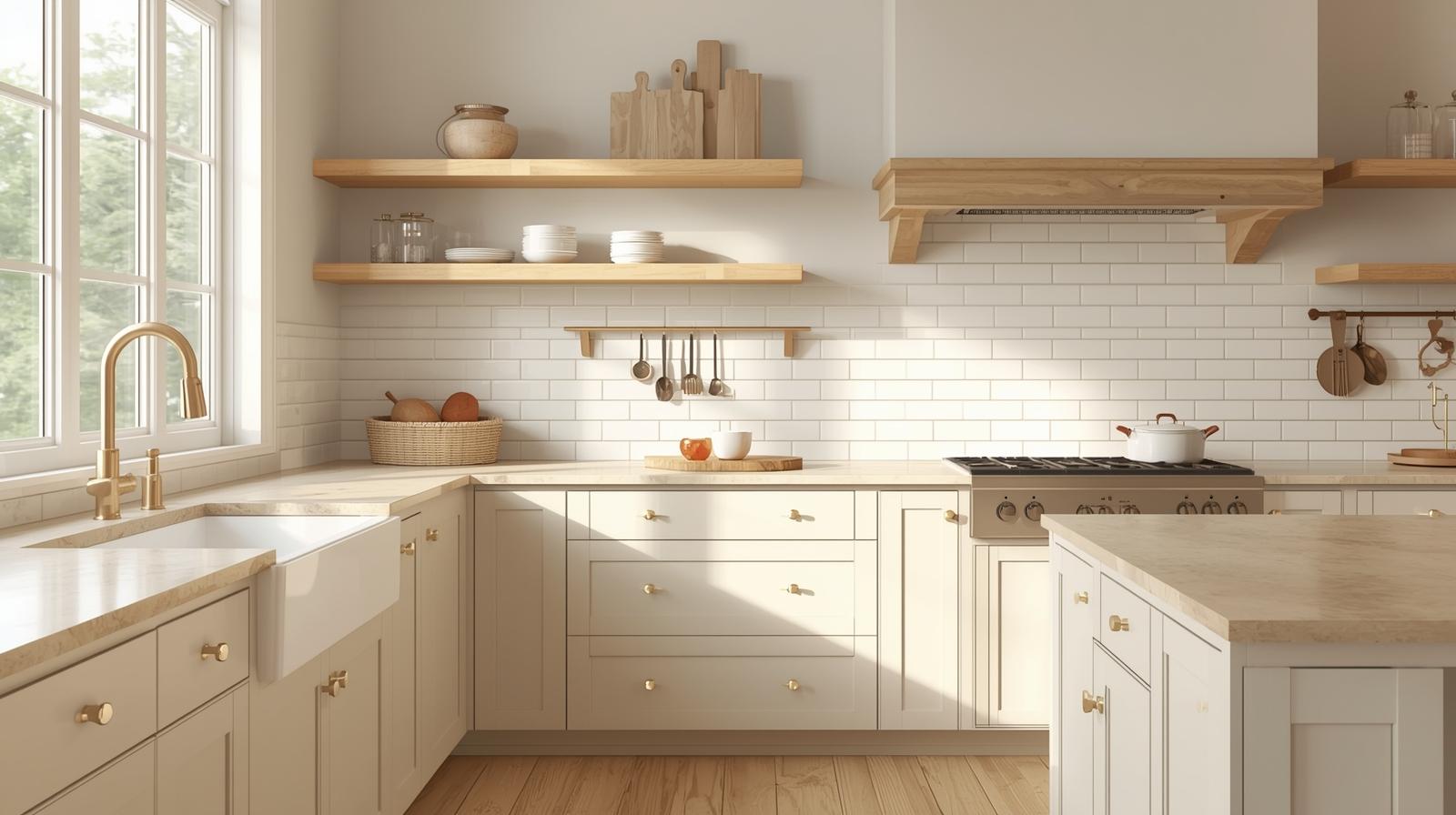 Cream shaker cabinets are the definitive foundation of the warm neutral kitchen, their clean recessed panel detailing adding just enough architectural character without competing with the overall softness of the palette. The crisp yet warm cream tone sits beautifully against natural wood elements and stone surfaces throughout the kitchen. Pair them with brushed brass cup pulls and knobs for a hardware choice that introduces warmth, quiet luxury, and a timeless quality that feels genuinely elevated without being ostentatious or trend dependent in any way.
