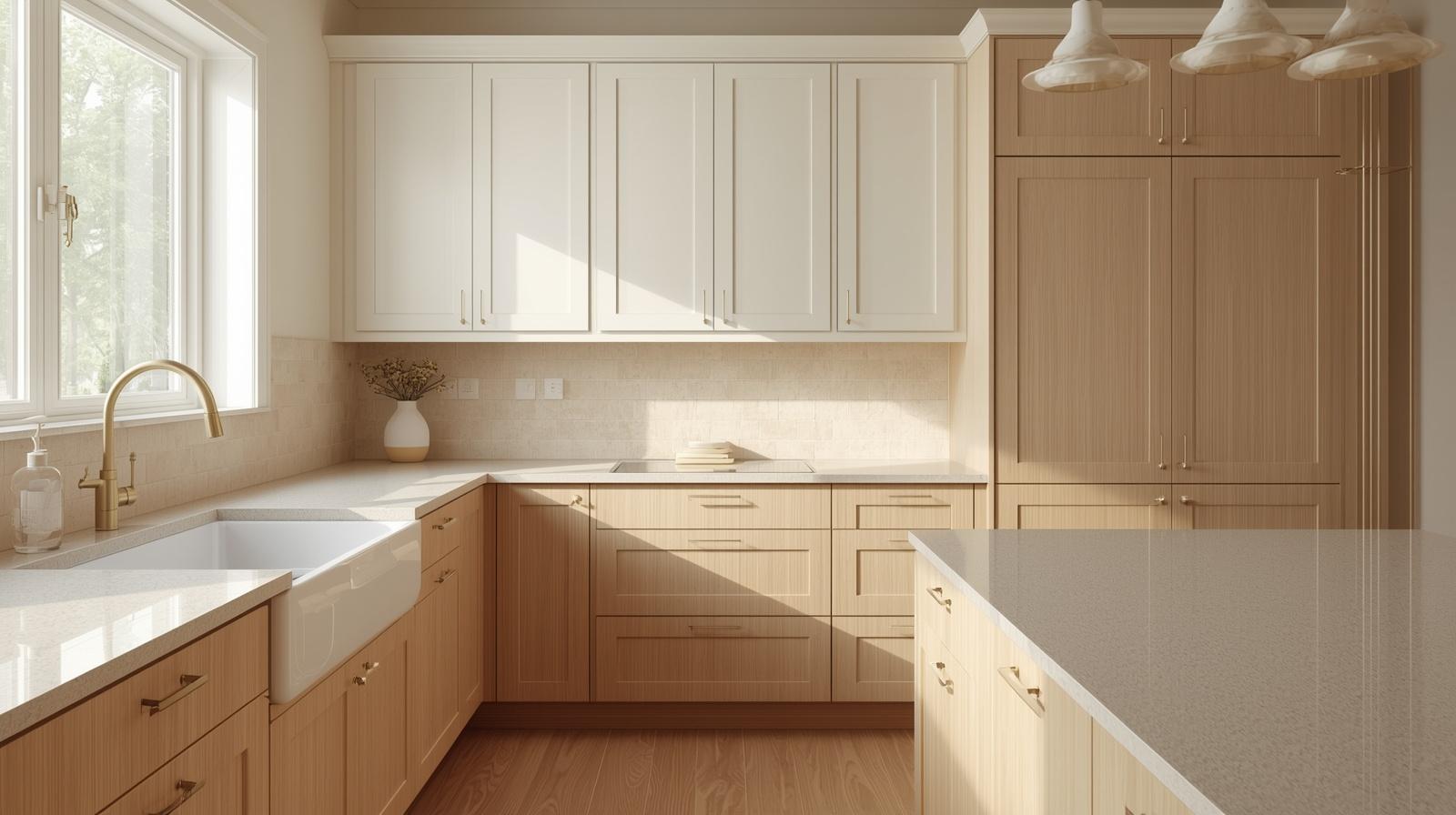 Combining cream upper cabinets with natural wood lower cabinets creates a beautifully balanced two tone kitchen palette that feels visually grounded, warm, and thoroughly considered. The lighter cream upper cabinets keep the upper half of the kitchen airy and open while the natural wood lower cabinets anchor the base with organic warmth and material richness. The horizontal transition between the two materials at counter height feels natural and intentional. Add a honed stone countertop in warm beige as the bridge between the two tones for a completely harmonious result.