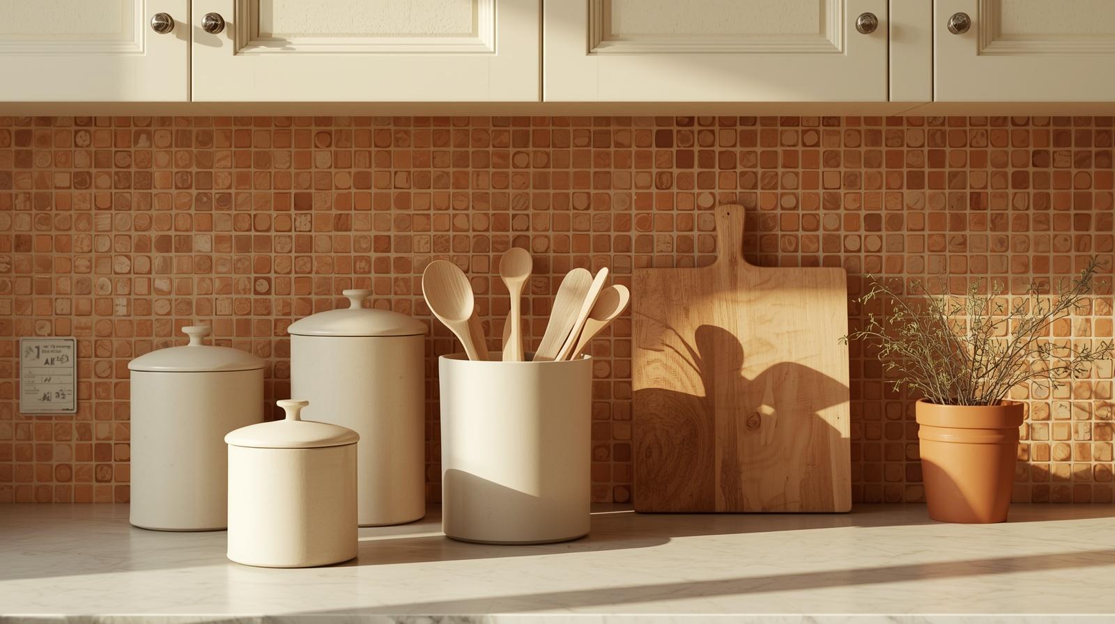 Styling kitchen countertops with a curated collection of vintage style ceramic canisters, wooden cutting boards, and handcrafted utensil crocks transforms the everyday functional objects of the kitchen into a cohesive decorative arrangement of considerable warmth and charm. Choose canisters in matte cream, speckled ivory, or soft warm grey ceramic with simple lettering or no decoration at all. Stand a collection of wooden spoons and spatulas in a hand thrown ceramic crock. Lean a well worn wooden cutting board against the backsplash. Each object should feel chosen rather than purchased as a set.