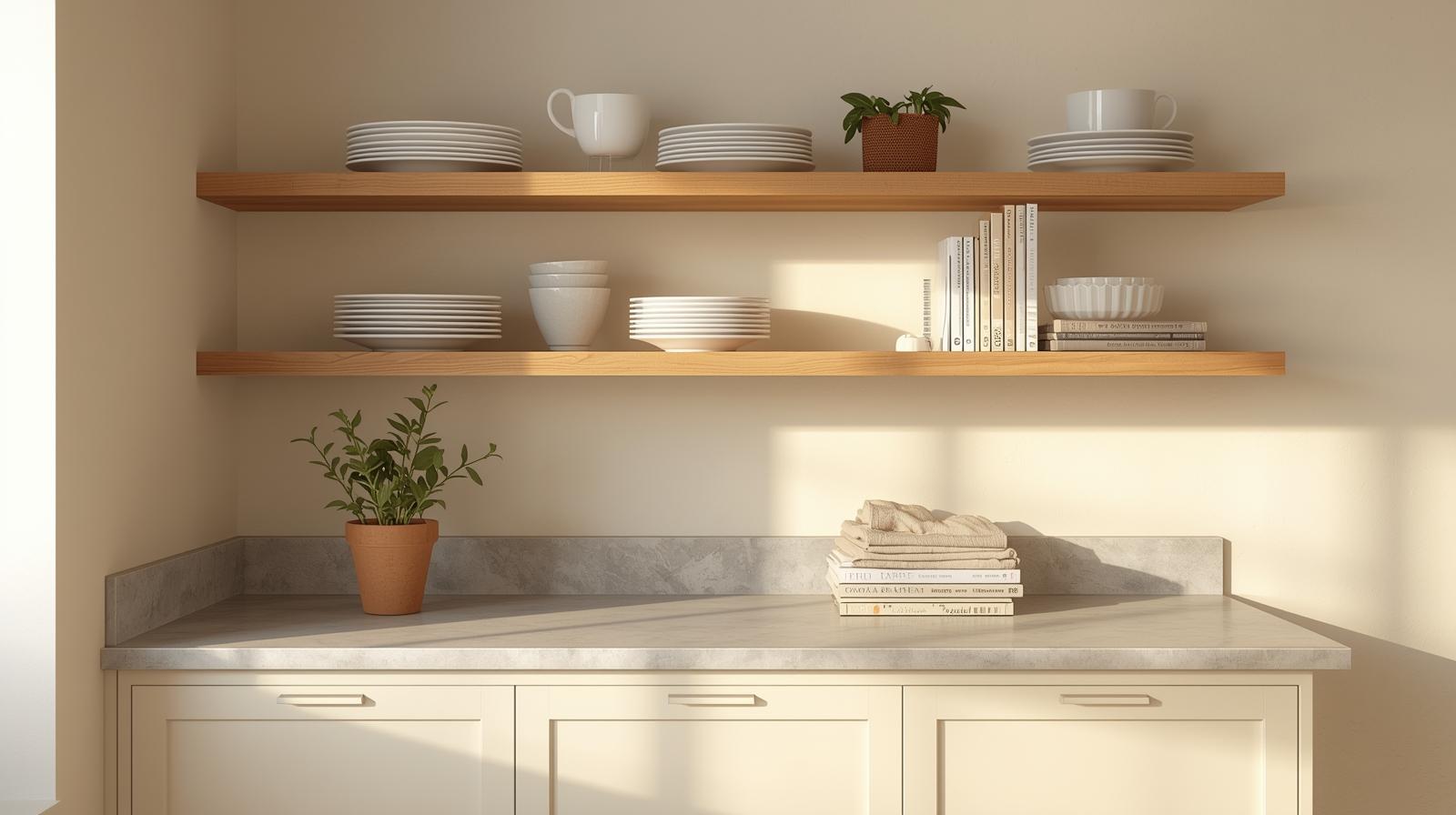 Replacing upper cabinets on one kitchen wall with natural oak open shelving instantly transforms the atmosphere from enclosed and utilitarian to open, warm, and genuinely inviting. The visible wood grain of oak introduces organic pattern and tonal warmth that painted cabinets simply cannot provide. Style the shelves with a considered edit of everyday items, stacked cream ceramic plates, a few cookbooks, small potted herbs, linen dish towels folded neatly, keeping the arrangement abundant enough to feel lived in but restrained enough to feel beautifully curated.