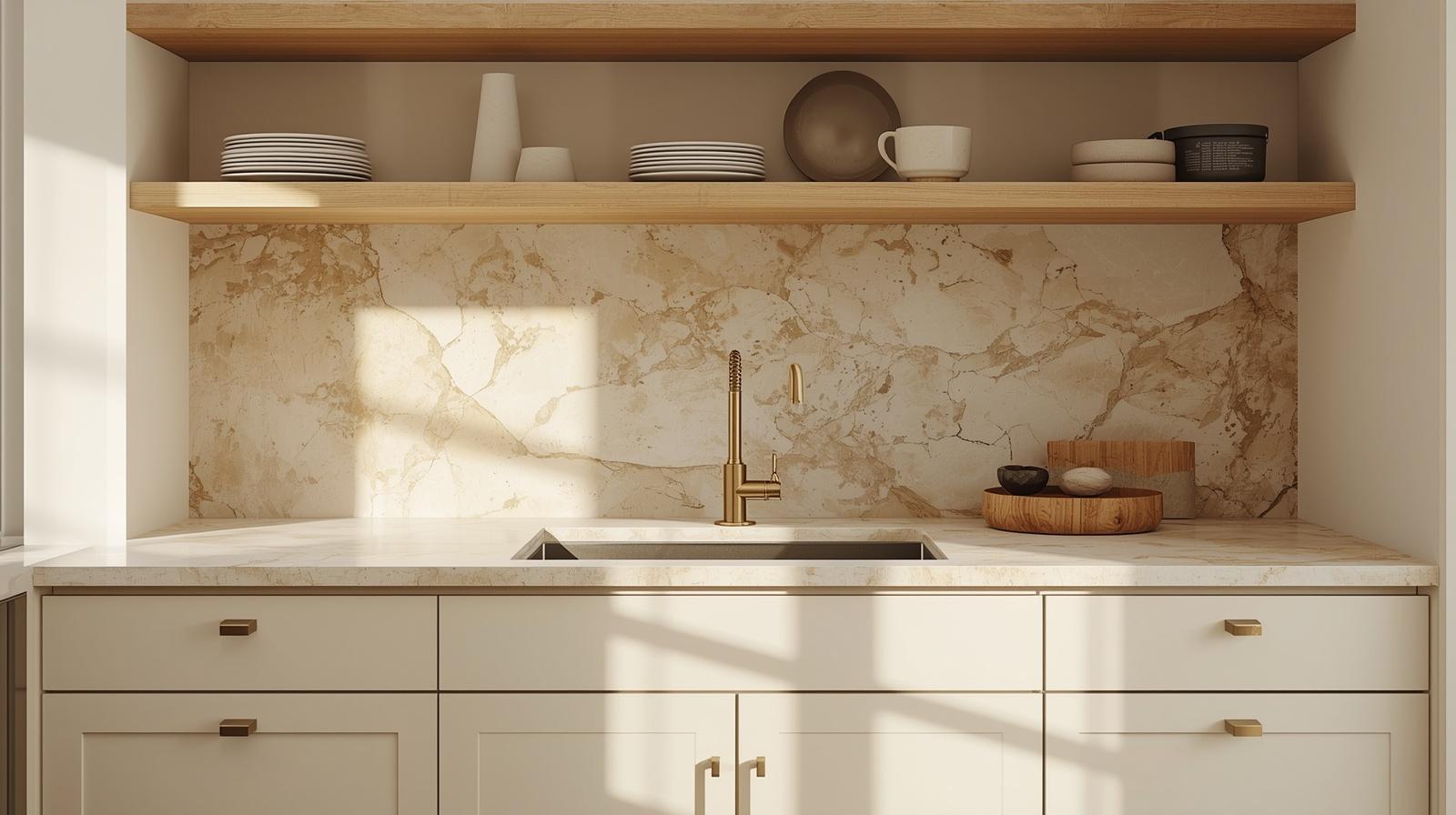 Honed limestone or travertine countertops bring a material depth and organic warmth to the neutral kitchen that polished stone or engineered quartz simply cannot replicate. The matte, velvety surface of honed stone absorbs light softly rather than reflecting it harshly, creating a quiet, sophisticated counter presence that feels genuinely luxurious. The natural fossil markings, subtle veining, and tonal variation within travertine add visual complexity and geological storytelling to every surface, making the kitchen feel as though it has been assembled from materials gathered from the earth with genuine care and intention.