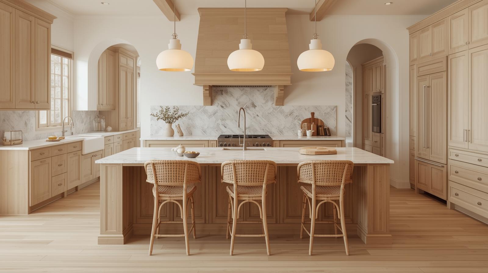 Hanging one large or two medium rattan pendant lights above the kitchen island introduces natural texture, organic warmth, and a relaxed, handcrafted quality to the overhead lighting that metal or glass pendants simply do not provide. The woven rattan diffuses the light source beautifully, casting warm dappled patterns across the island surface and ceiling above. In a cream and wood kitchen, rattan pendants feel like a completely natural material extension of the overall design language, reinforcing the commitment to natural, warm, organic materials throughout every element of the space.