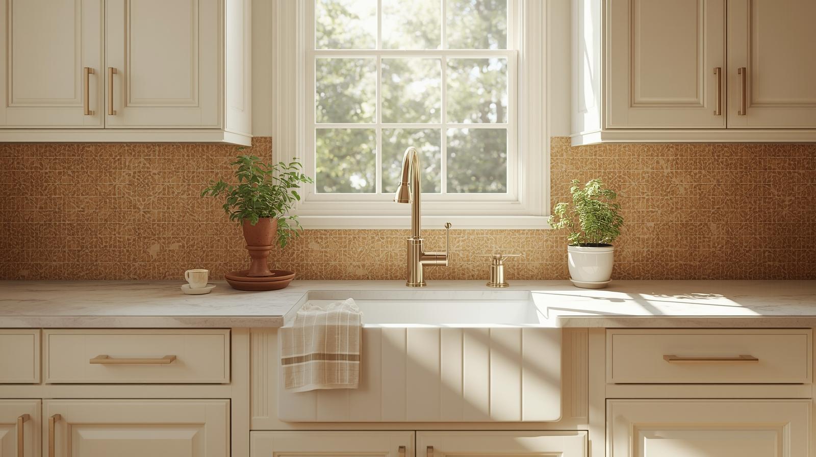 Dressing the kitchen window in a linen Roman blind rather than curtains or shutters introduces a soft, tailored warmth to the window treatment that complements the warm neutral kitchen palette with quiet refinement. Choose unbleached natural linen, warm oatmeal, or soft cream fabric for a tone that recedes gently into the overall palette without creating contrast. When raised, the neatly folded blind frames the window cleanly. When lowered, it fills the kitchen with a beautifully diffused, warm light that transforms the quality of the entire space throughout the day.