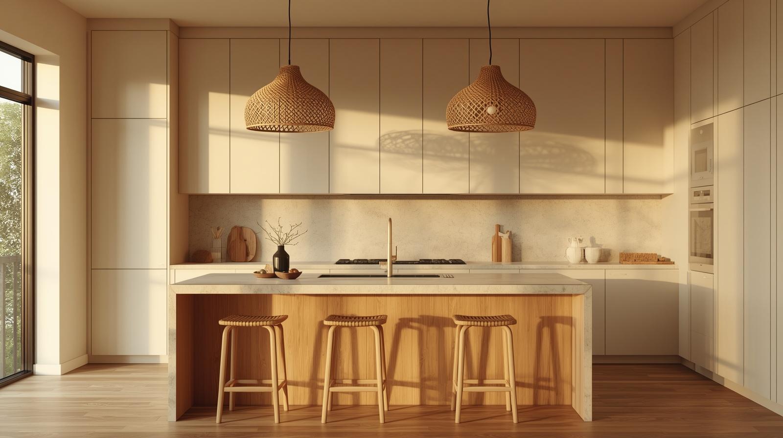 9. Rattan Pendant Lights Above the Island