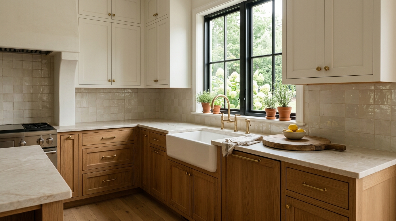 Pairing warm honey toned or medium oak lower cabinetry with linen white upper cabinets creates a two tone kitchen composition that feels grounded, organic, and thoroughly modern in its farmhouse sensibility. The natural wood grain of the lower cabinets anchors the kitchen with earthy warmth while the linen white uppers keep the upper half of the room feeling open, airy, and light. Together they establish a palette of complete natural harmony that requires very little additional decoration to feel finished, considered, and beautifully resolved from every angle in the room.