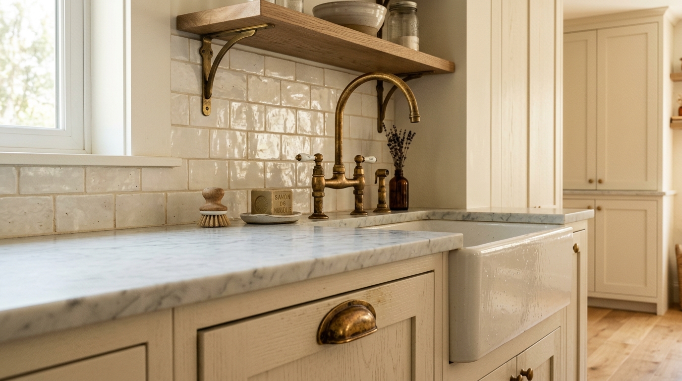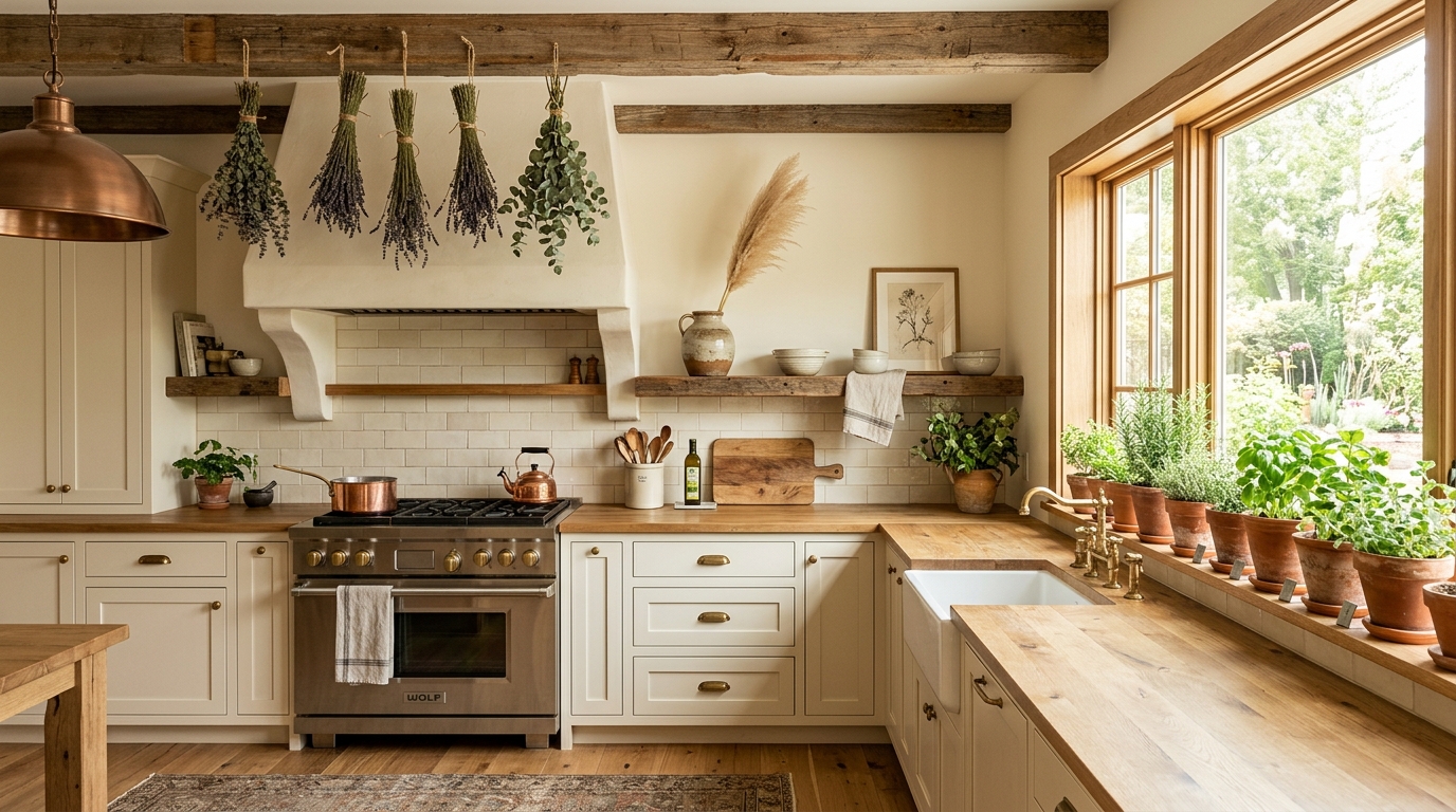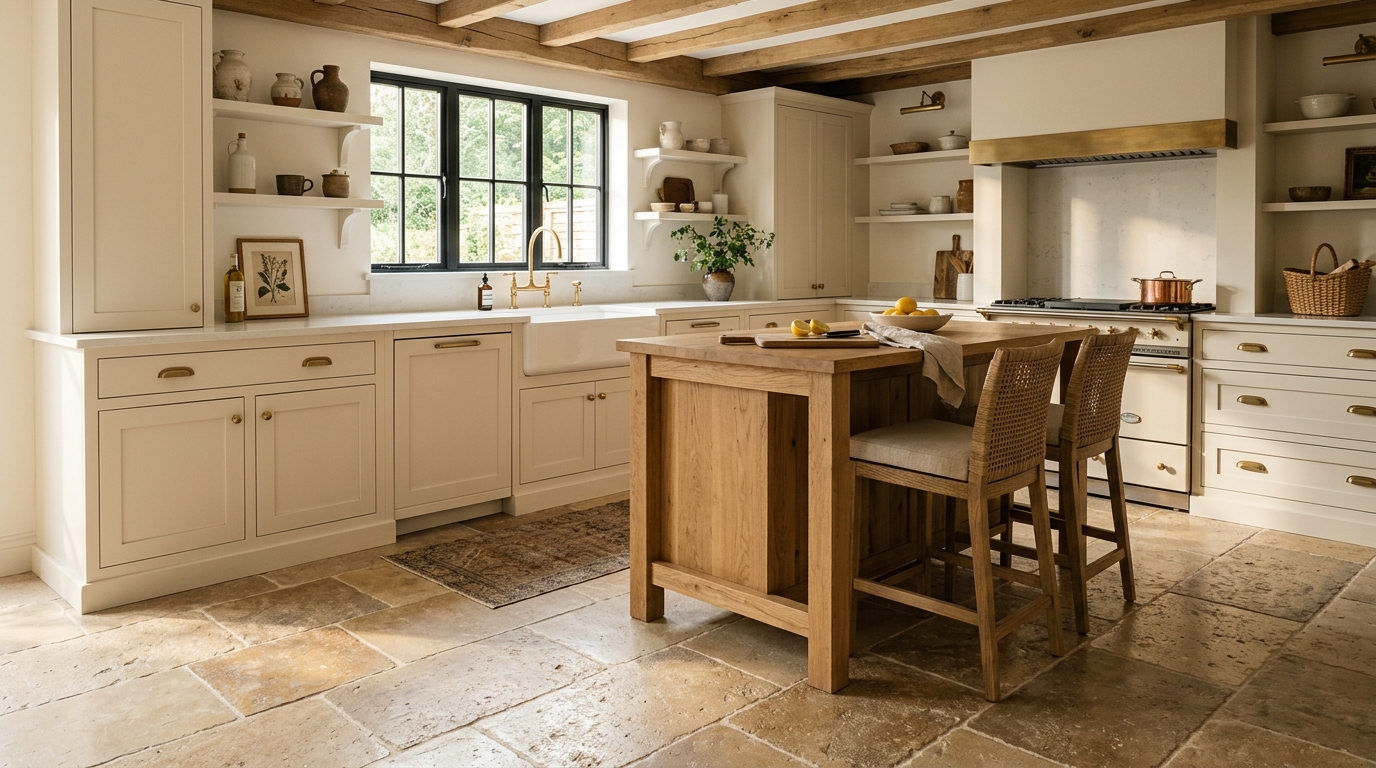 Large format limestone or sandstone floor tiles laid throughout the modern farmhouse kitchen create a floor plane of extraordinary natural beauty and ancient material warmth that immediately connects the space to the stone farmhouses and rural manor kitchens of European architectural tradition. The warm buff, honey, and cream tones of natural limestone complement every element of the warm farmhouse palette above — wood, cream cabinetry, brass, and handmade ceramics — with a completely effortless material harmony that feels neither designed nor accidental but simply and profoundly right.
