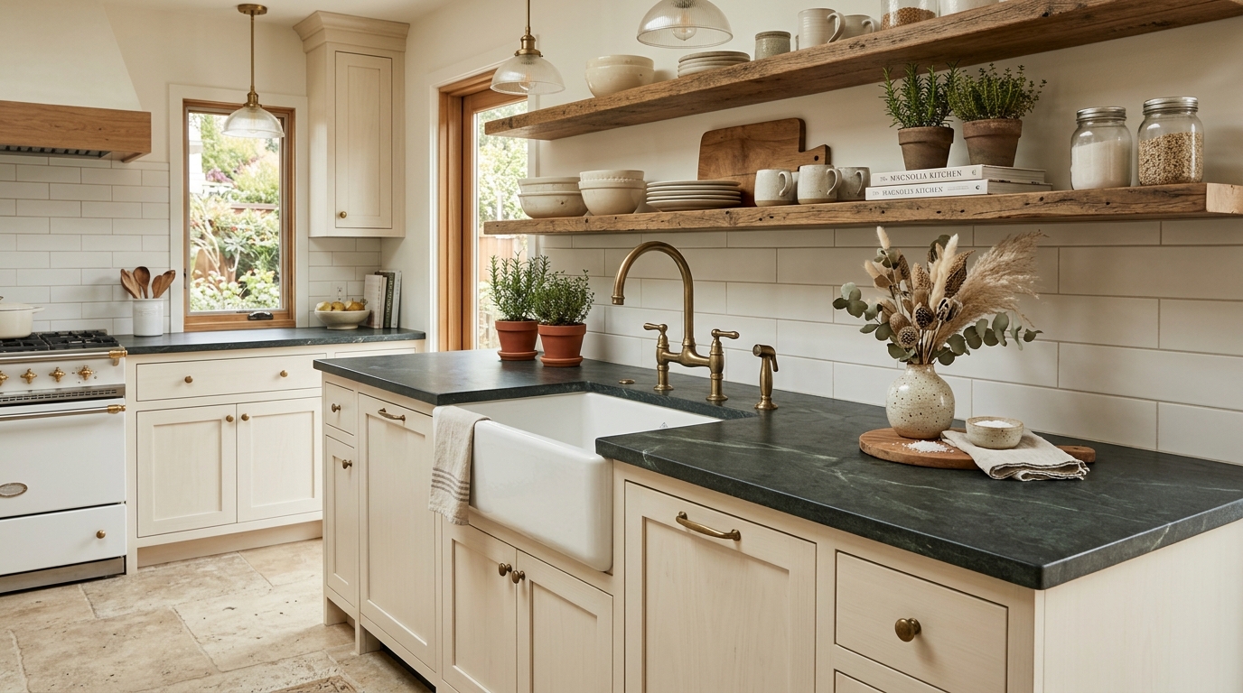 Soapstone countertops bring a dark, velvety richness and quiet geological depth to the modern farmhouse kitchen that feels genuinely unlike any other stone surface available. Their deep charcoal grey tone with soft green or blue undertones creates a striking and sophisticated contrast against warm wood cabinetry and cream painted surfaces. Soapstone develops a beautiful natural patina with use and regular oiling, darkening gradually and acquiring a warmth and character that makes every kitchen surface feel genuinely irreplaceable and deeply personal over time.