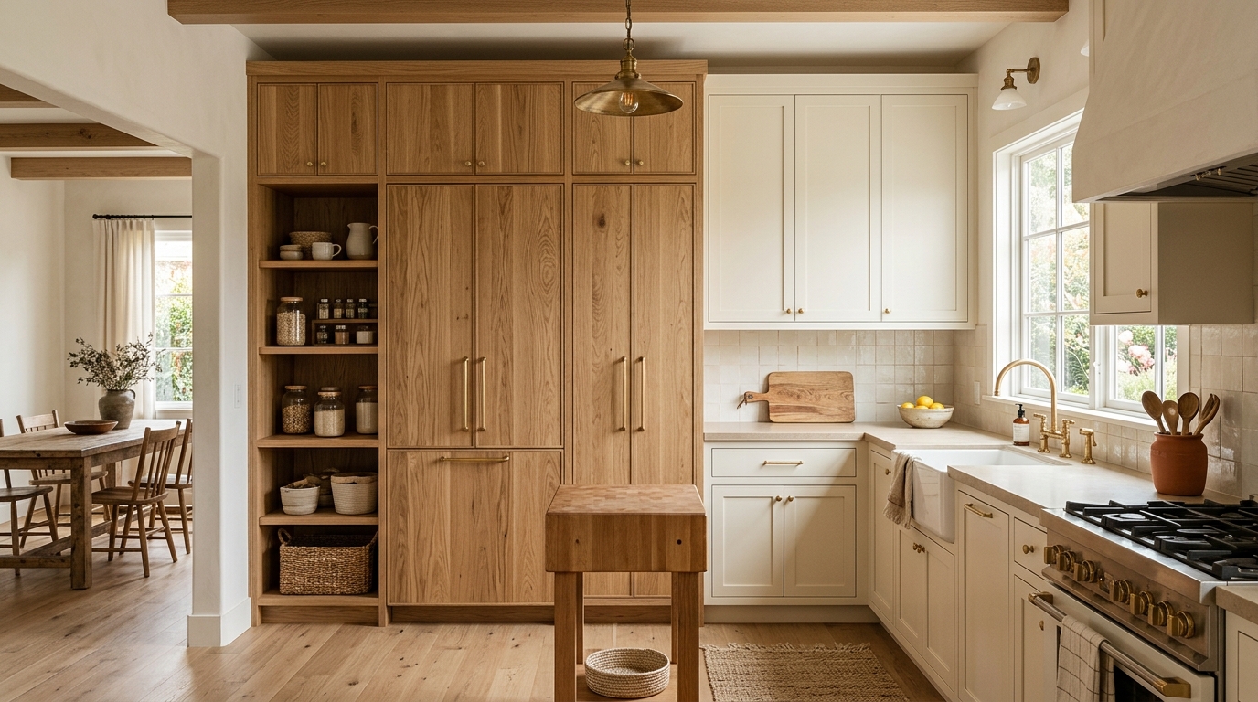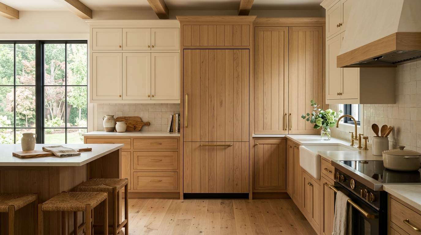 Concealing the refrigerator behind custom cabinet panels that match the surrounding cabinetry perfectly is one of the most impactful and underappreciated design decisions available in the modern farmhouse kitchen. The integration transforms the largest and most visually disruptive appliance in the kitchen into a seamless part of the cabinetry wall, allowing the natural materials, warm wood tones, and considered detailing of the kitchen to remain the dominant visual experience without interruption. The result is a kitchen that feels more like a beautifully designed room than a functional workspace defined by its appliances.