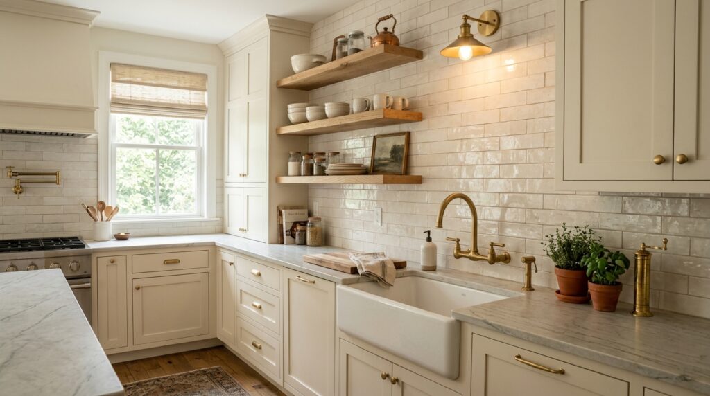 A backsplash covered entirely in handmade ceramic tiles in warm ivory or soft off white brings an artisanal surface quality and subtle luminosity to the modern farmhouse kitchen that factory produced tiles can never authentically replicate. Each tile carries the gentle imperfections of the maker’s hand — slight variations in thickness, soft undulations in the glaze surface, and tonal shifts from one tile to the next — creating a wall of quiet, breathing warmth rather than a flat, uniform expanse. The handmade quality speaks directly to the farmhouse value of honest, skilled craftsmanship in every detail.