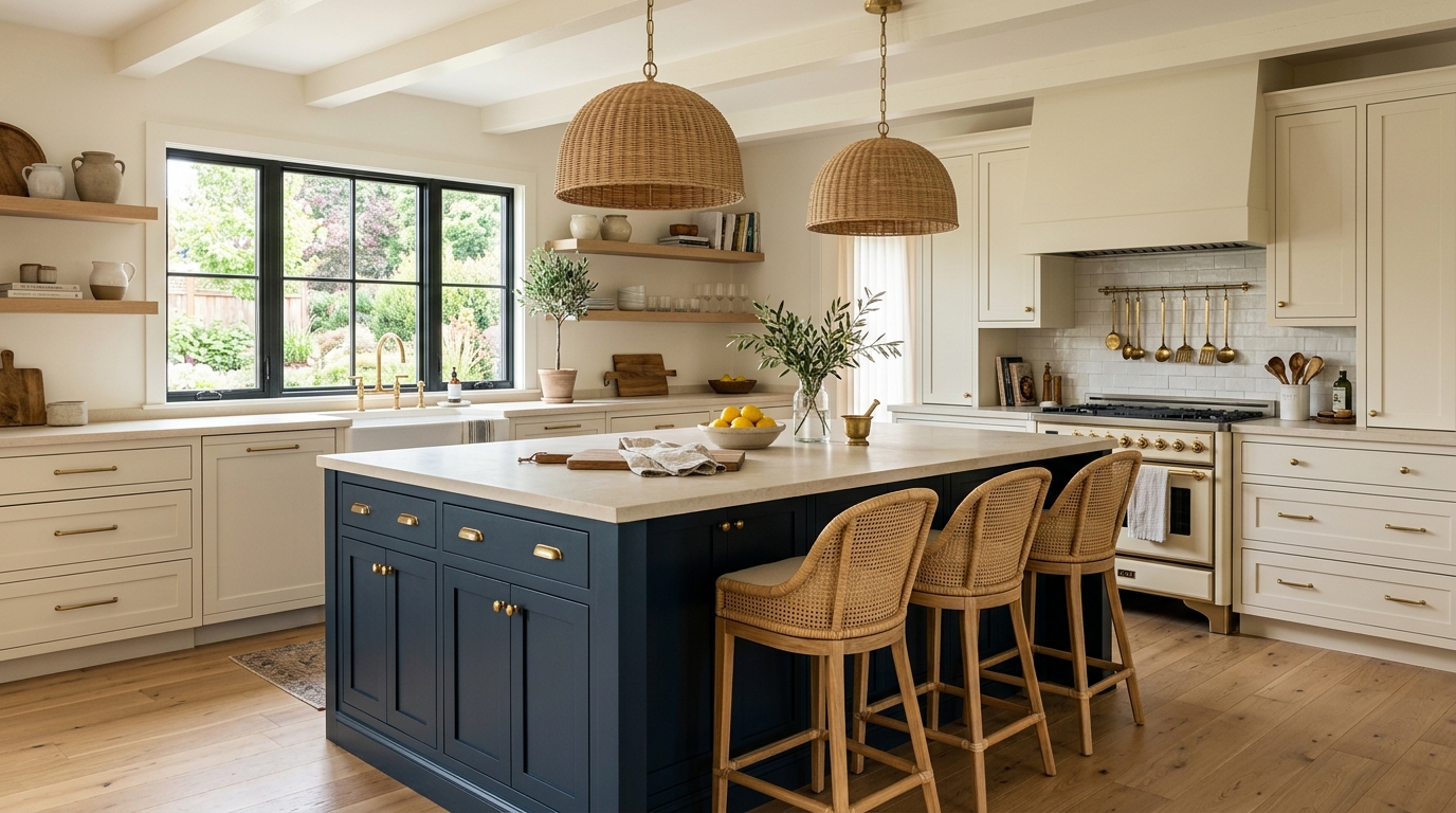 Introducing a deep navy blue kitchen island into a surrounding palette of warm cream and natural wood cabinetry creates a bold, anchoring contrast that gives the kitchen a focal point of considerable sophistication and design confidence. The depth of the navy grounds the island visually, making it feel like a substantial piece of furniture rather than a built-in fixture. Topped with a warm stone or butcher block countertop and fitted with brushed brass hardware, the navy island becomes the defining design moment that elevates the entire kitchen from pleasant to genuinely memorable.