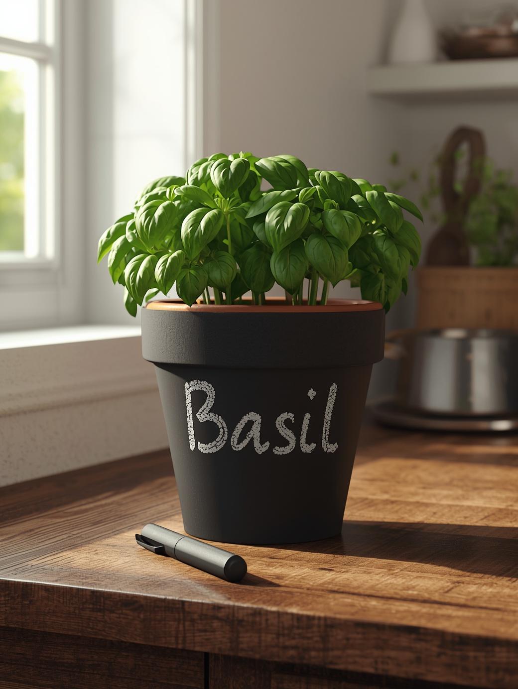 Chalkboard paint turns your pot into a writable surface — perfect for labeling herbs or plants. Paint the entire pot with chalkboard paint and let it cure. Then write the plant name with chalk or a chalk pen. You can wipe it off and rewrite anytime. It is super practical and stylish at the same time. These are especially popular as kitchen herb garden pots on countertops and windowsills.