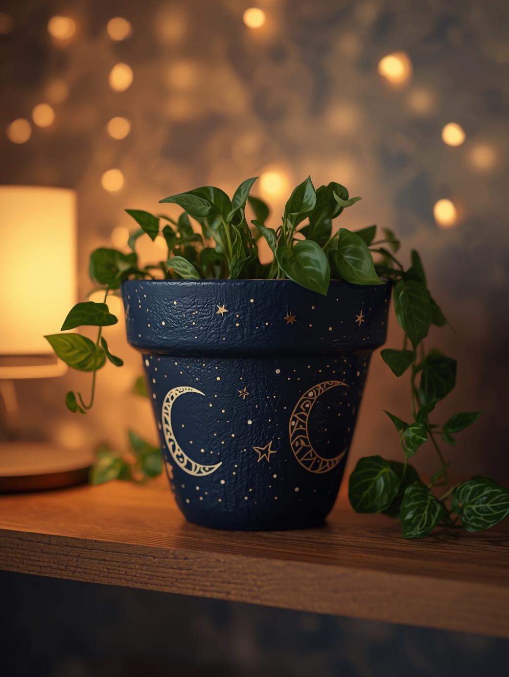 Paint the pot in deep navy or midnight blue, then use a fine brush or white paint pen to add crescent moons, tiny stars, and dots. You can also add thin gold accents for a magical touch. These celestial painted flower pots are perfect for a bedroom corner, a cozy reading nook, or a boho-themed shelf. They are simple to make and absolutely stunning when displayed with trailing vines or dark-leafed plants.
