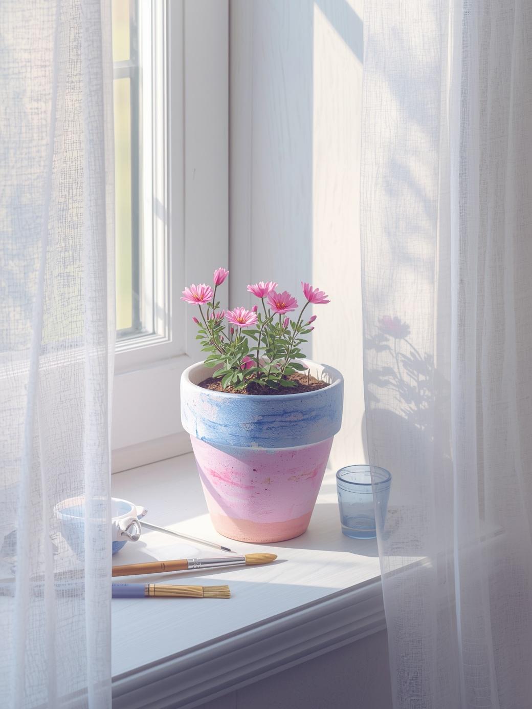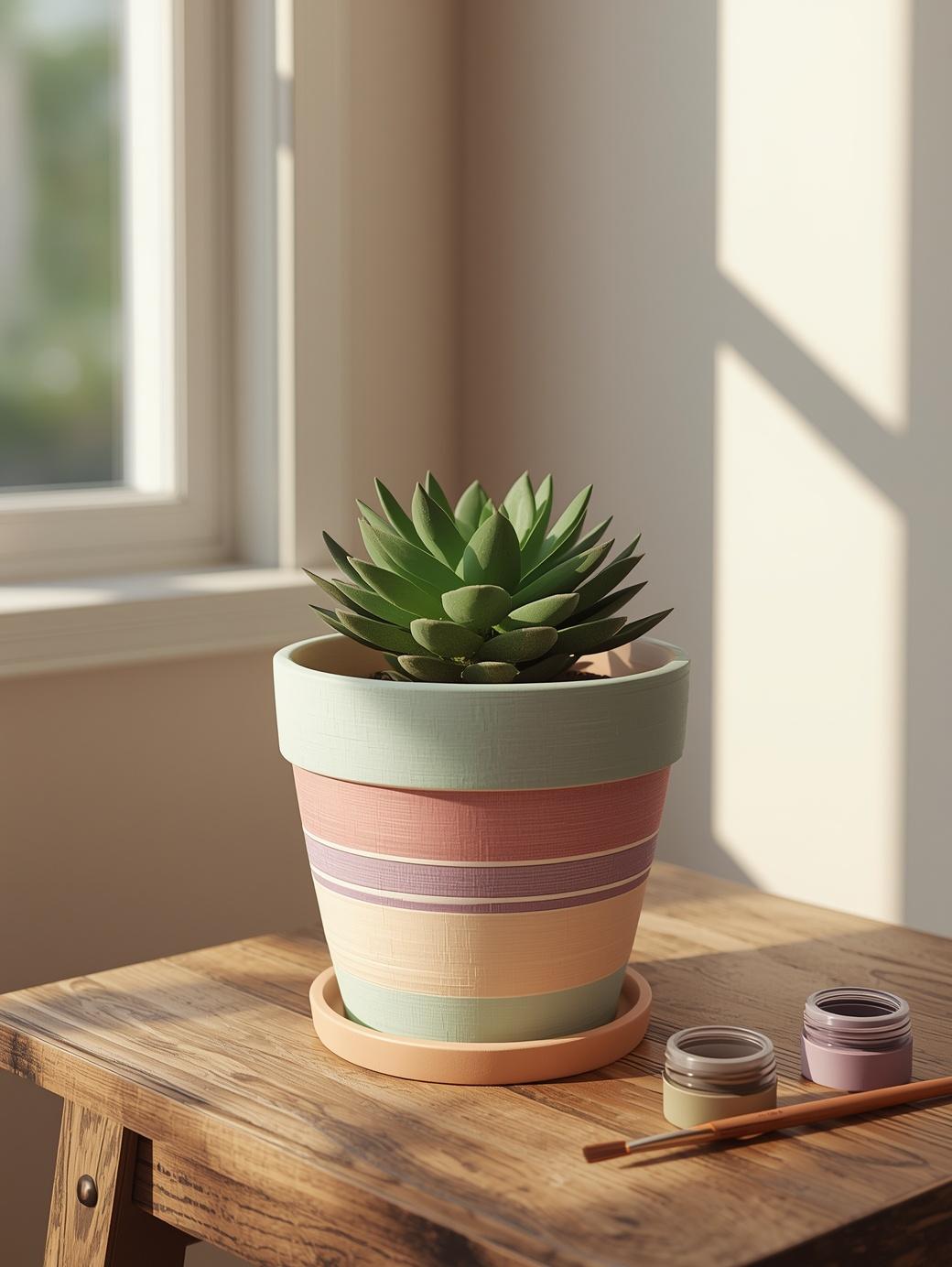 Pastel stripes are perfect for beginners. All you need is a plain terracotta pot, some pastel acrylic paints, and painter’s tape. Tape horizontal lines around the pot, paint between them, and let it dry. The soft colors — think mint green, blush pink, and lavender — look fresh and cheerful. This is one of the simplest painted flower pot ideas you can finish in under an hour.