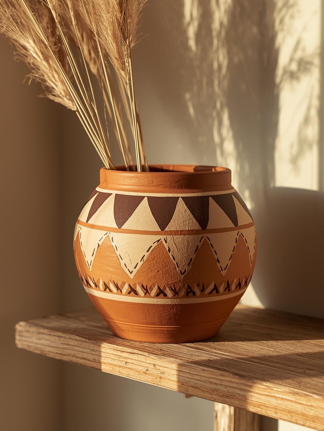 Geometric patterns give your pots a modern boho look. Use a fine-tip paint pen or a small brush to draw triangles, diamonds, or zigzag lines in earthy tones like terracotta orange, cream, and brown. You do not need to be an artist — simple shapes look stunning. These painted flower pots fit beautifully on shelves, patios, or as part of a boho home decor setup.