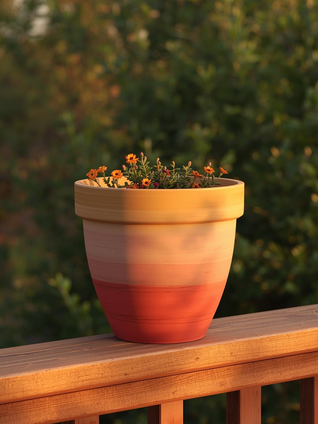 An ombre pot blends two or three colors from top to bottom, creating a beautiful gradient. Choose colors like coral, peach, and soft yellow for a sunset vibe. Apply the darkest color at the base and blend upward while the paint is still wet. It looks stunning and professional but is actually very beginner-friendly. This is one of those painted flower pot ideas that always gets compliments.