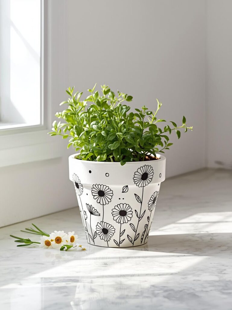 A black and white floral pot looks elegant and timeless. Start with a white base coat and use a thin black paint pen to draw simple flowers — daisies, roses, or wildflowers. Even rough, hand-drawn lines look charming and artistic. These pots pair perfectly with neutral home decor. They also make wonderful handmade gifts for friends and family who love simple, classic flower pot painting ideas.