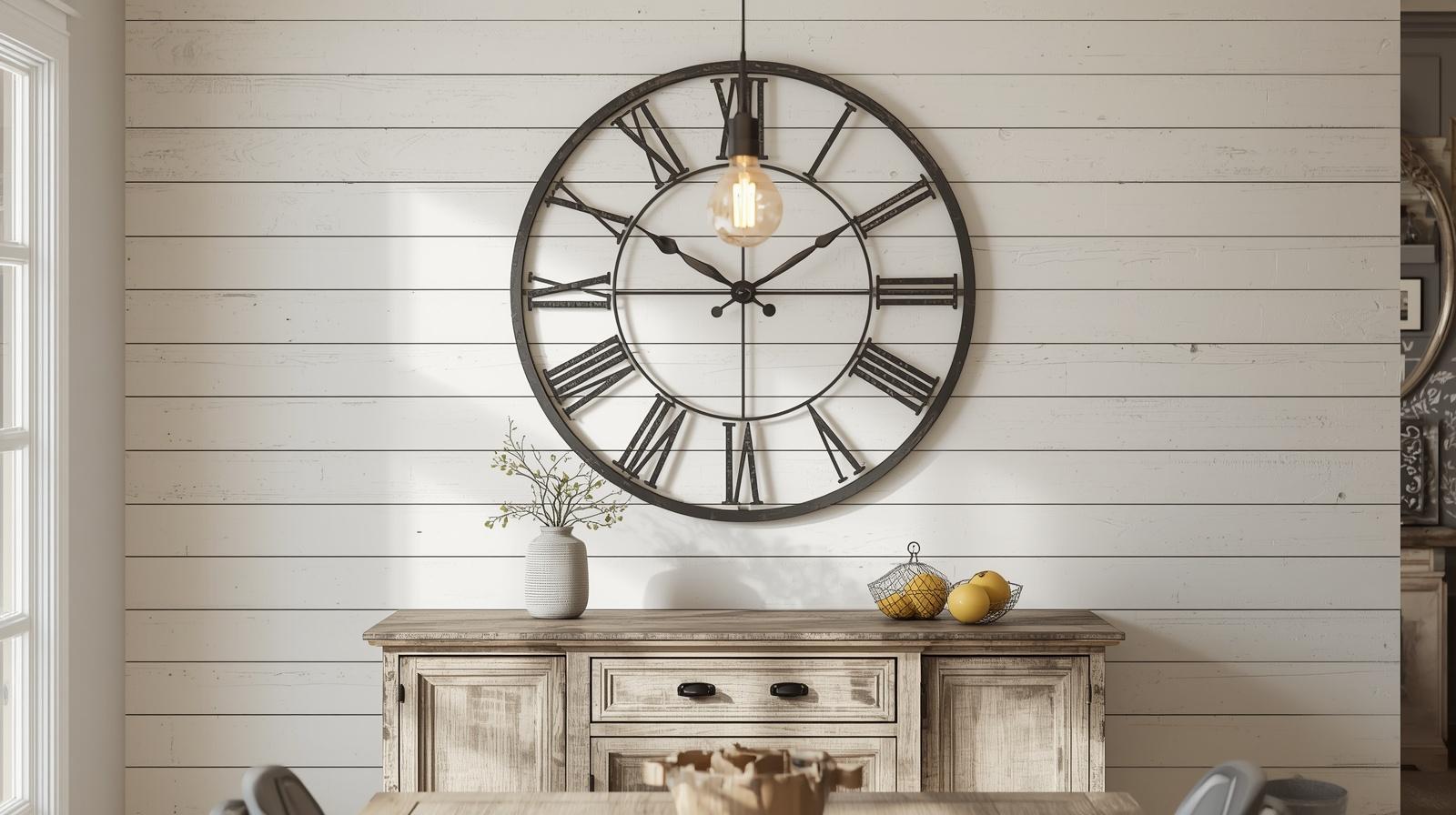 A large vintage clock on the dining room wall is a farmhouse classic that never loses its charm. Choose a distressed wood or aged metal finish in black, rust, or weathered white. The oversized scale makes it a natural focal point above a buffet or sideboard, grounding the room with character and a sense of timeless, unhurried family living.