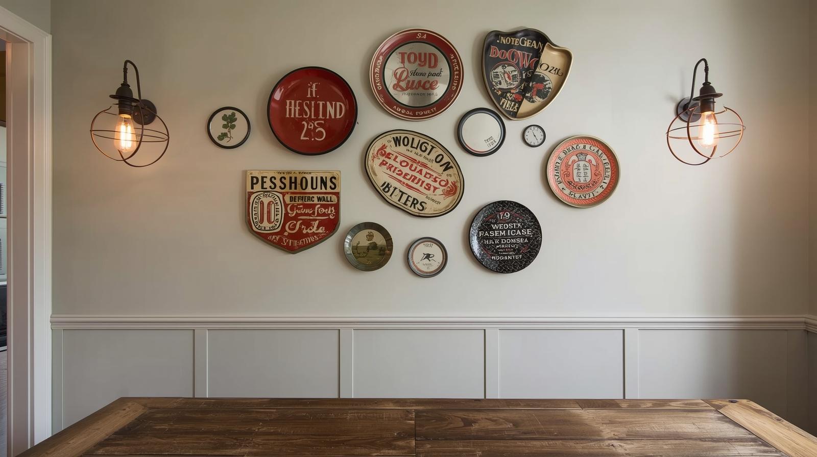 Antique-style tin signs, enamelware plates, and vintage advertising pieces grouped together on a dining room wall create a general store aesthetic that feels warmly nostalgic. Mix circular and rectangular shapes at varying heights. Keep the color palette consistent — cream, red, navy, and black work well — so the cluster reads as a cohesive collection rather than random clutter.
