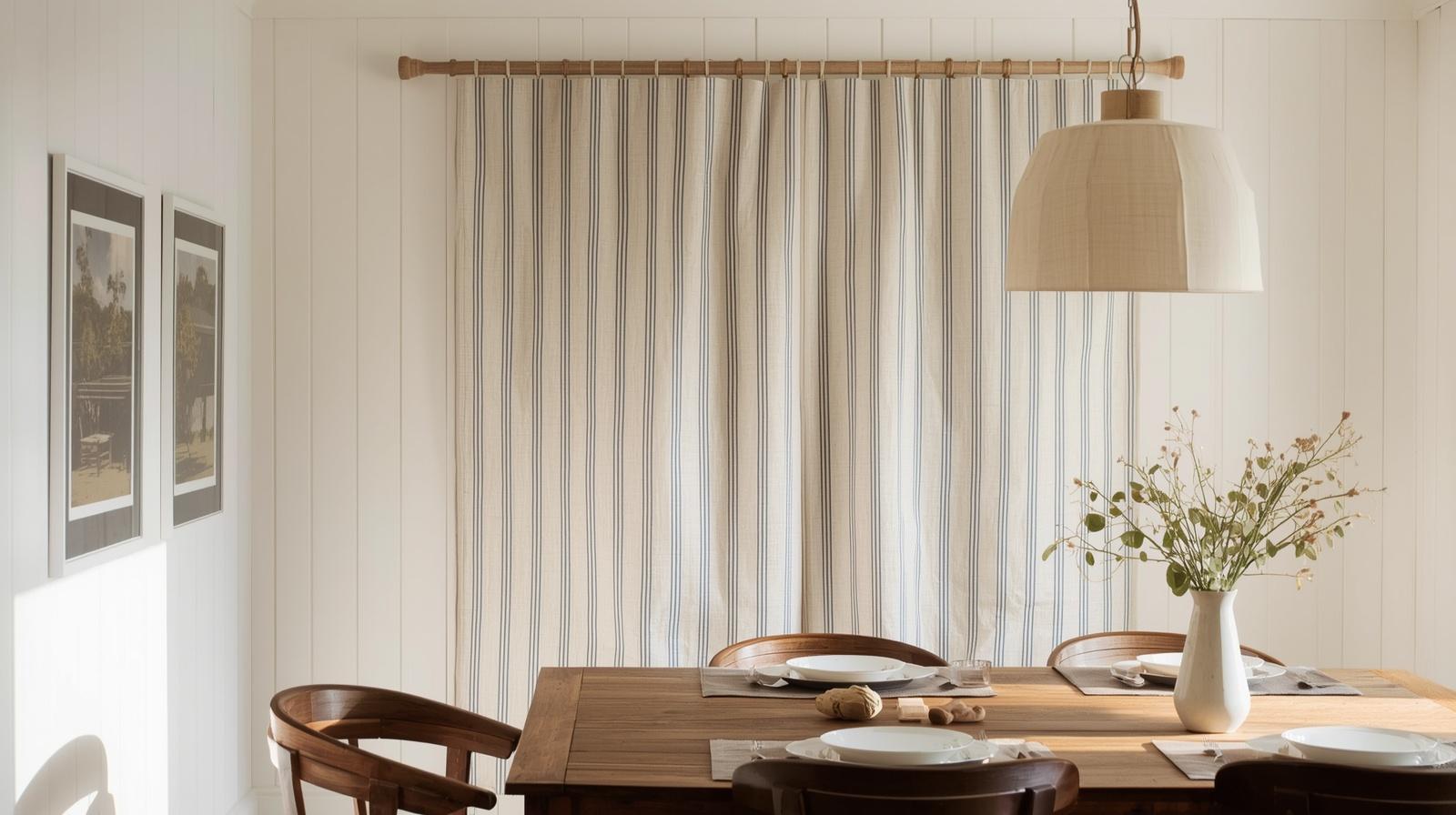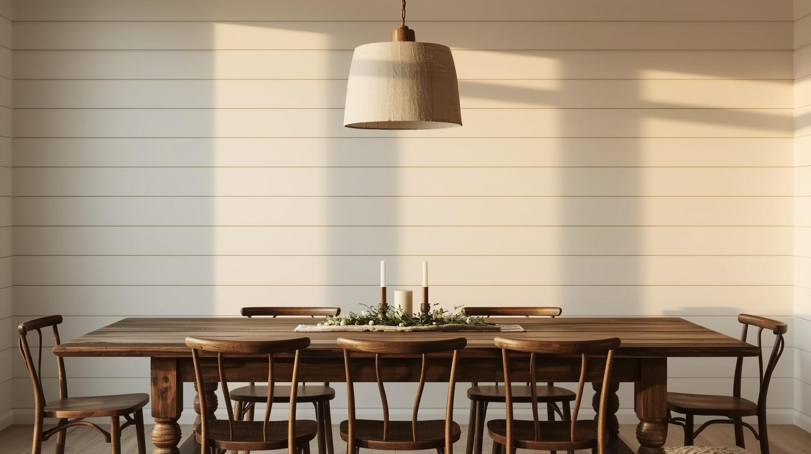 Shiplap remains the defining wall treatment of farmhouse style for good reason. A single shiplap accent wall behind your dining table creates architectural depth and texture that makes the whole room feel designed. Paint it soft white, warm cream, or even a muted sage green. The horizontal lines draw the eye and make the dining space feel wider and more intentional.