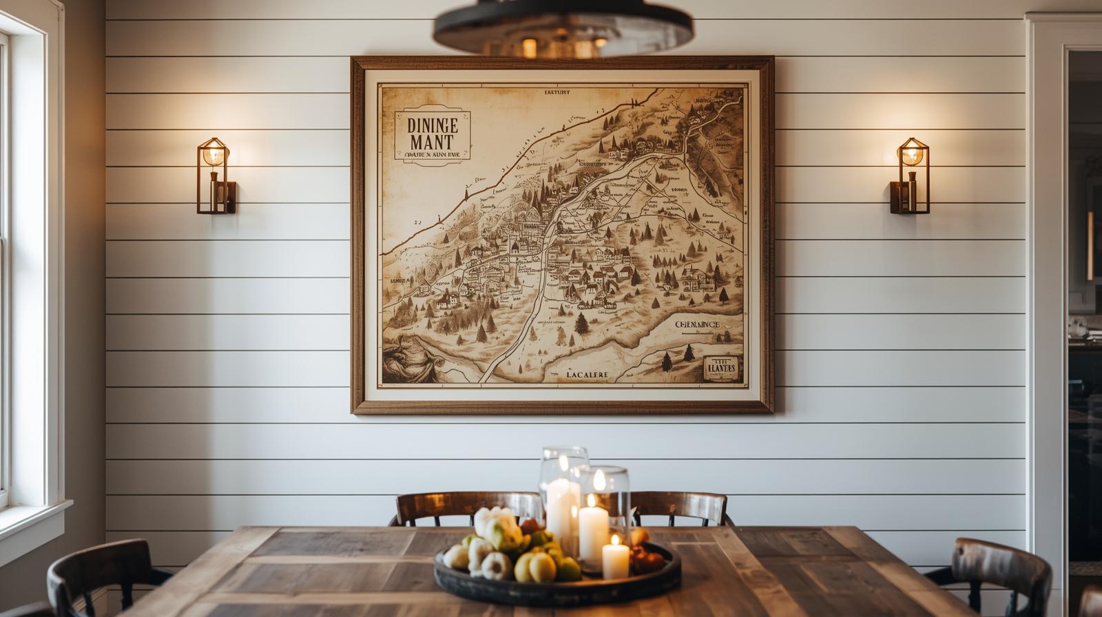 A custom or vintage map of your hometown, the town where you got married, or a place your family returns to every summer transforms a dining room wall into a deeply meaningful conversation piece. Choose a large format, frame it simply in natural wood, and mount it where it can be seen from the table. Every meal becomes a quiet celebration of where you belong.