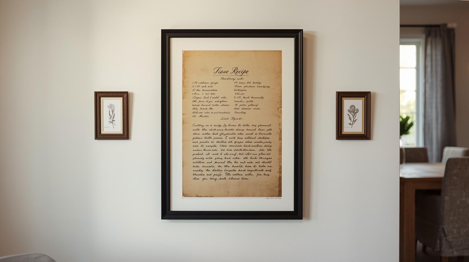 Instead of generic wall art, frame a handwritten family recipe — grandma’s biscuit recipe, a beloved pie crust, or a holiday soup. Use aged paper, a simple black frame, and mount it among small botanical prints. This deeply personal touch makes the dining room wall tell a story that guests always stop to read, turning a meal into a memory.