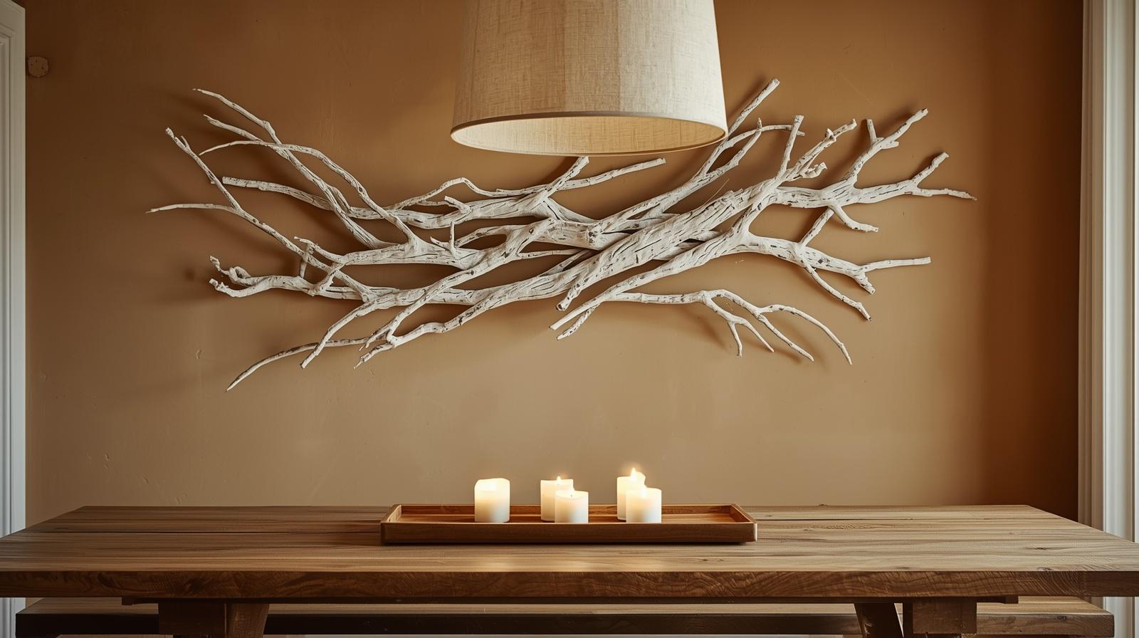 Carved or naturally shed antler wall pieces and abstract branch sculptures add organic, wild texture to farmhouse dining rooms. Choose a piece in natural wood tones or whitewashed finish and mount it solo as a statement piece above the table. It brings an outdoor, cabin-inspired energy that feels grounded, masculine, and warmly rustic without being overtly hunting-themed.
