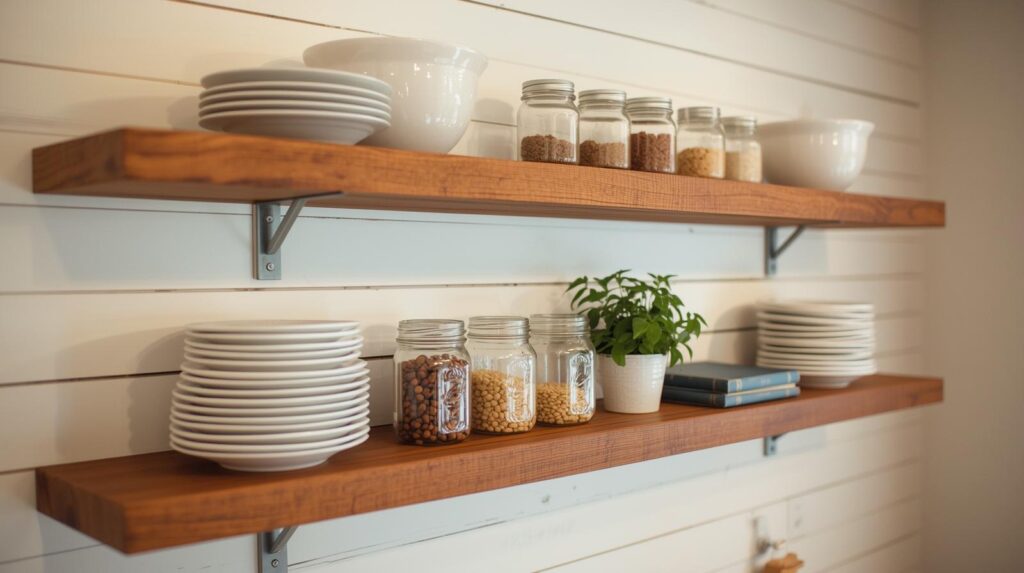 4. Line the Wall with Open Floating Shelves Styled Like a Pantry