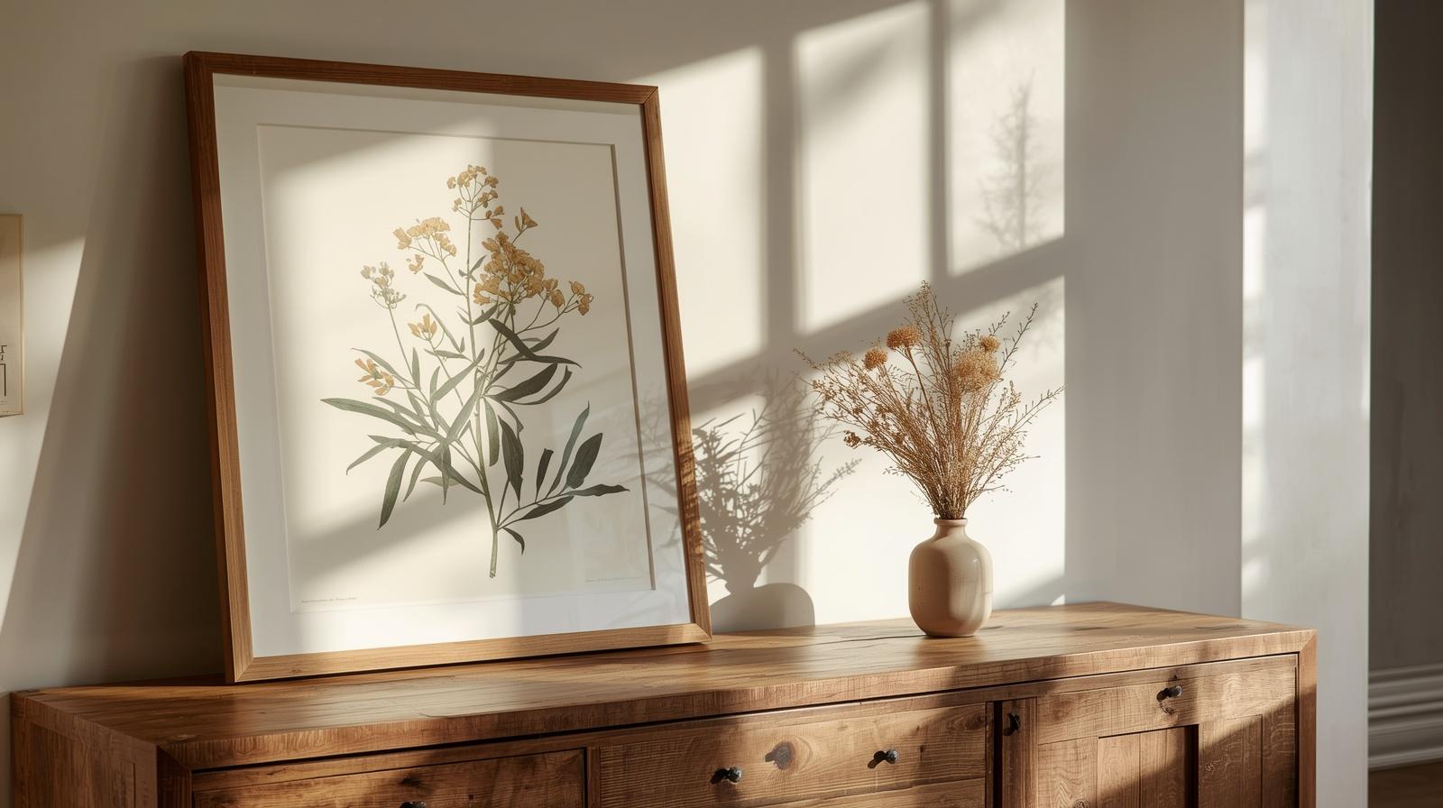A single large botanical print, think oversized wildflower illustration, a meadow grass study, or a vintage herb chart makes an immediate statement. Choose muted, earthy tones like ochre, sage, and cream to keep it farmhouse-appropriate. Lean it against the wall on a sideboard rather than hanging it for a casual, collected look that feels intentionally relaxed.