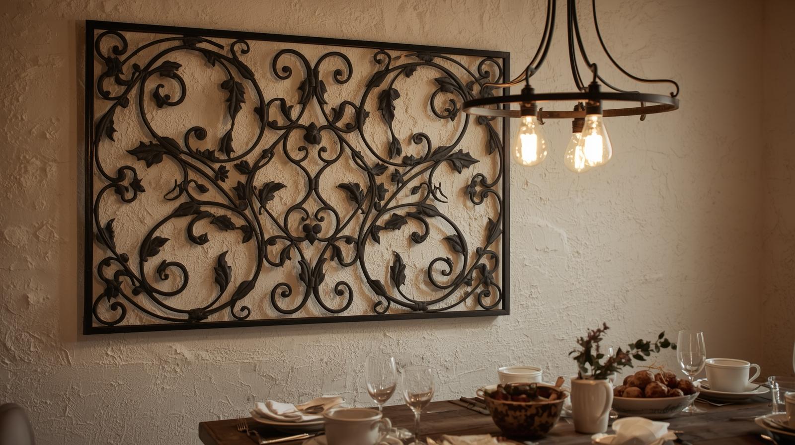 Wrought iron wall art, geometric panels, scrolling vine patterns, or abstract forged pieces, adds a sturdy, artisan quality to farmhouse dining rooms. Unlike wood decor, metal introduces a contrasting material that gives the wall dimension and visual weight. Mount a single statement panel on a neutral wall and let its craftsmanship speak without surrounding clutter.