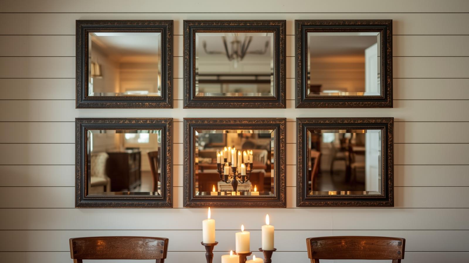 A grid of four or six small windowpane-style mirrors arranged together mimics the look of an architectural window and bounces light beautifully around the dining room. Choose aged wood or black metal frames for farmhouse appropriateness. This trick makes smaller dining rooms feel significantly larger while adding a vintage, repurposed aesthetic that feels handpicked rather than store-bought.