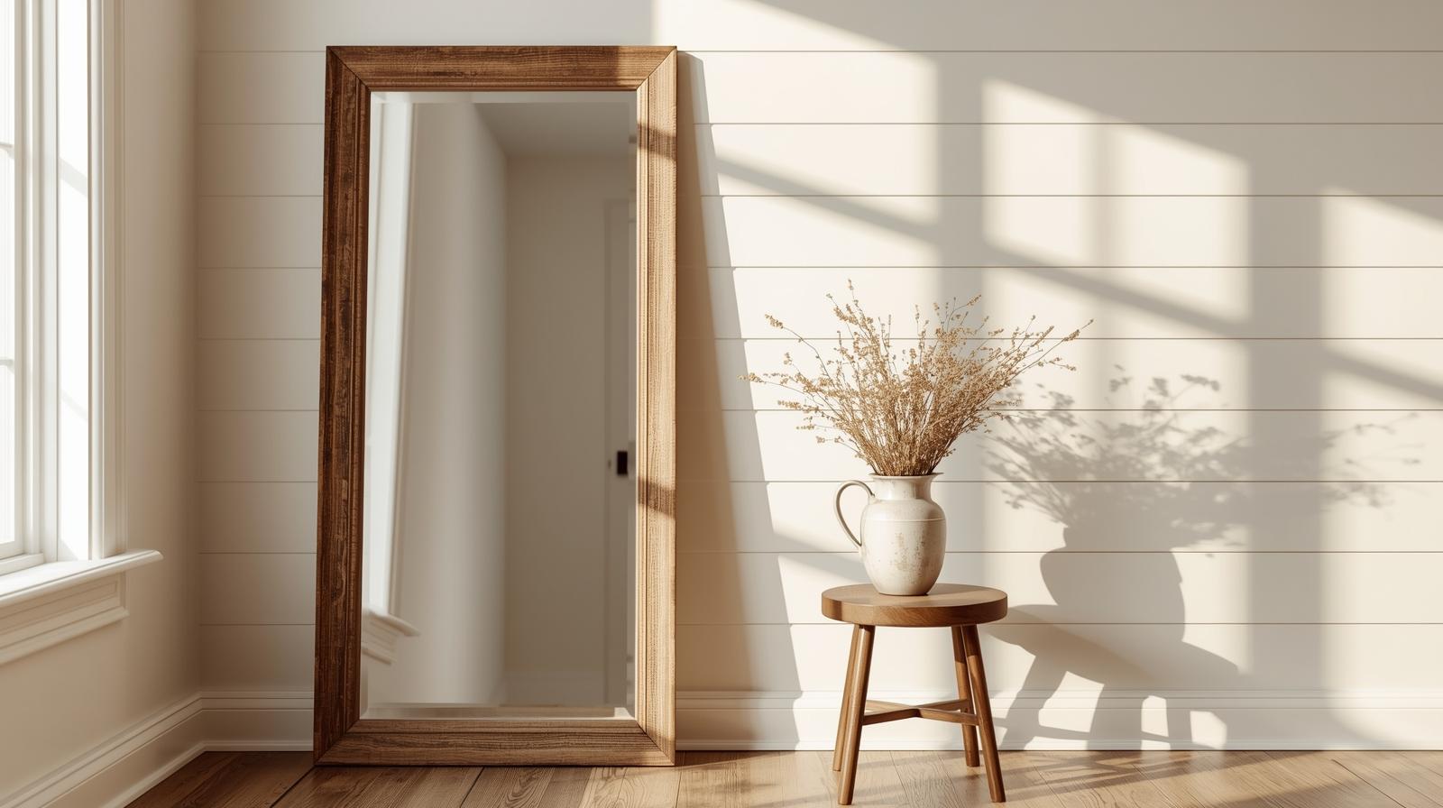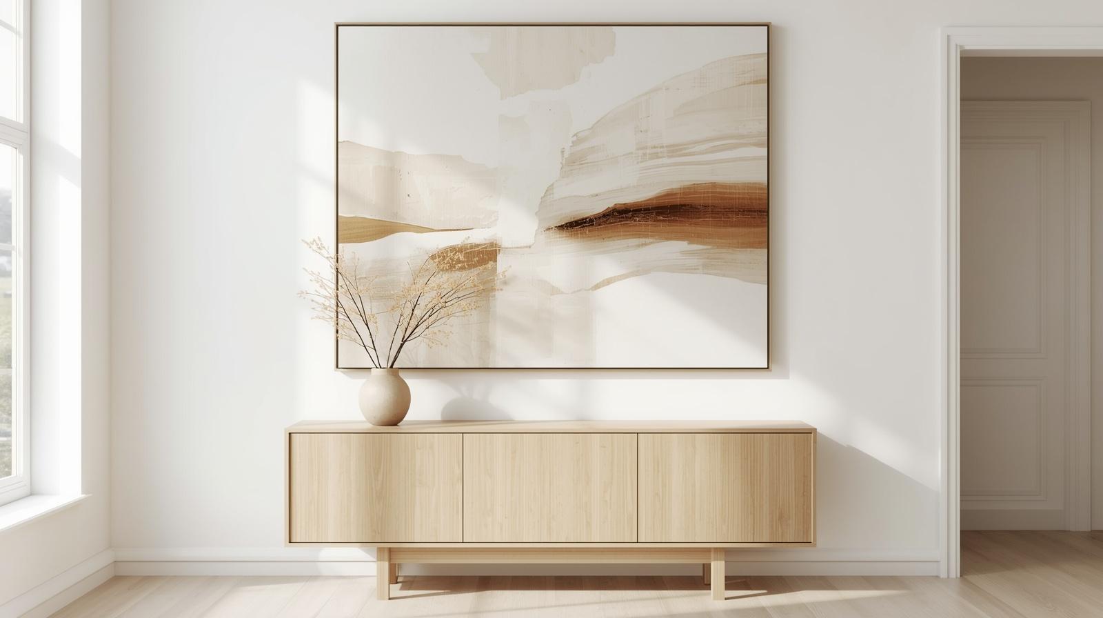 Large-scale wall art anchors a dining room and gives the eye a place to rest. For modern farmhouse style, choose oversized black and white photography, abstract neutral canvas art, simple botanical prints, or large-scale typography in a vintage serif font. One big piece always makes more impact than several small ones — and it instantly elevates the room to a more polished, designer-level aesthetic.