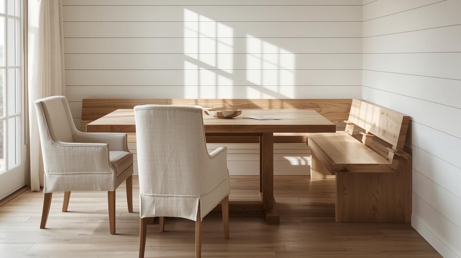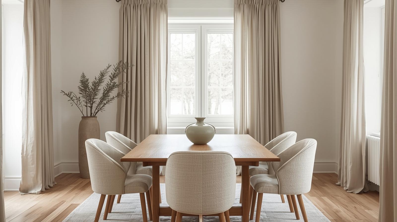 Nothing makes a dining room feel more inviting than upholstered chairs. Choose linen, boucle, or cotton fabric in cream, warm grey, or soft taupe. Mix them with a wooden bench on one side for that casual farmhouse feel. Upholstered seating adds softness, texture, and a layer of quiet luxury that elevates the entire dining room atmosphere.