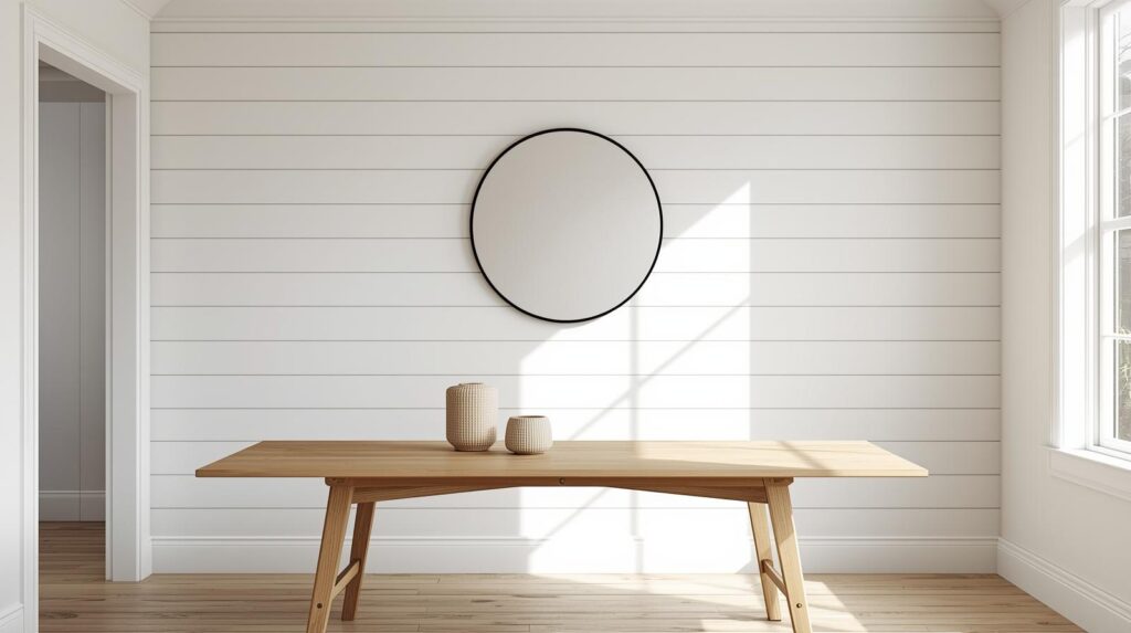 Wall treatments are one of the most powerful design tools in a modern farmhouse dining room. Shiplap or board-and-batten paneling adds architectural character, depth, and that signature farmhouse texture instantly. Paint it crisp white for a clean, airy feel or warm greige for a moodier, more intimate dining atmosphere that still feels fresh and contemporary.