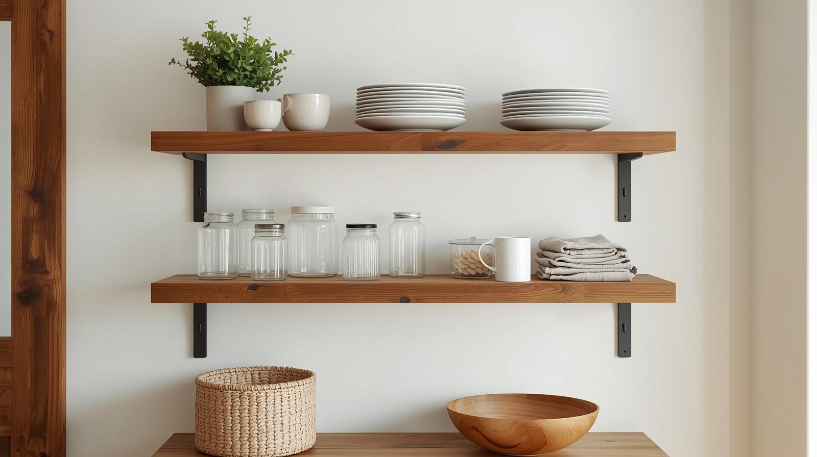 Open wooden shelves on the dining room wall serve both form and function beautifully in a modern farmhouse space. Style them with stacked white ceramic dishes, linen napkins folded neatly, glass jars, small potted herbs, and a few decorative objects. This lived-in, curated display adds layers of personality and warmth while keeping everything practical and accessible for everyday dining use.
