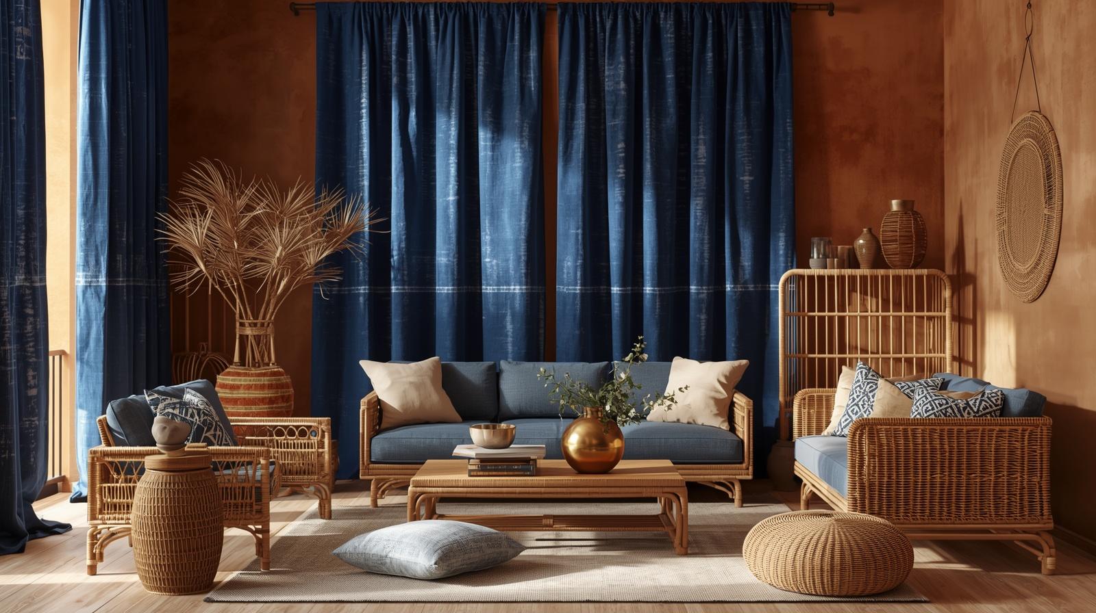 Hanging floor to ceiling curtains in hand dyed indigo fabric — whether the deep, saturated midnight blue of traditional West African adire cloth, the mottled resist dyed patterns of shibori inspired indigo, or the bold batik patterns of Yoruba adire eleko — creates a window treatment of profound cultural richness and deep, luminous color that transforms the quality of light entering the room with beautiful, atmospheric effect. The deep indigo color contrasts magnificently with warm terracotta walls, golden brass accents, and natural wood tones throughout the Afro-hemian interior, creating a color story of complete, vibrant sophistication.