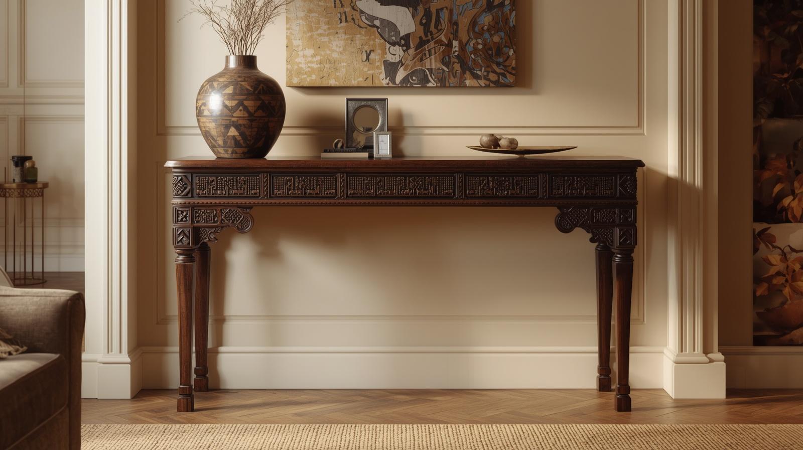 Incorporating hand carved wooden furniture pieces featuring traditional African geometric motifs — interlocking triangles, chevrons, diamond forms, and stylised natural symbols — brings an irreplaceable layer of artisanal depth and cultural storytelling to the Afro-hemian interior. A carved console table, a sculpted wooden bench, or a side table with hand worked surface detailing reads as both functional furniture and genuine sculptural art. Choose pieces in dark ebony, warm mahogany, or natural teak for tones that anchor the space with organic authority and rich material warmth.