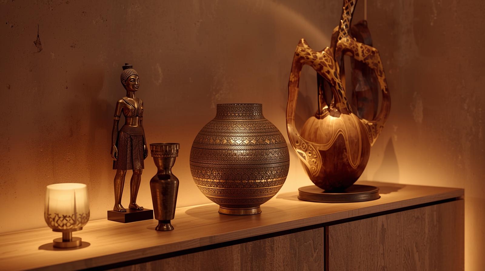 Incorporating cowrie shells, glass trade beads, and beaded decorative accessories into the Afro-hemian interior adds layers of historical resonance, textural variety, and delicate ornamental beauty that speak directly to centuries of African decorative tradition and cultural symbolism. Arrange cowrie shells in ceramic bowls as table accessories, hang beaded wall panels as decorative art, drape long strands of trade beads from hooks or over sculptural objects, and choose cushions or textiles with beaded detailing for a layer of sparkling, tactile decoration that catches the light with a warm, intimate glitter throughout the space.