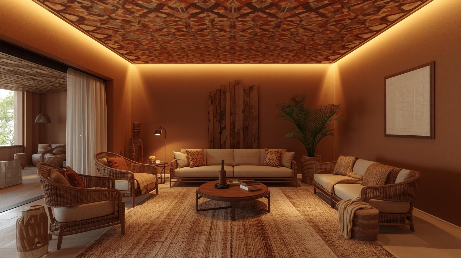 Treating the ceiling as an active design surface rather than a neutral overhead plane is a particularly powerful Afro-hemian gesture that draws the eye upward and envelops the entire room in pattern, color, and cultural richness from every angle simultaneously. Paint a large scale geometric pattern directly onto the ceiling in complementary earth tones, hang a large piece of woven textile from ceiling hooks as a fabric canopy, or apply a bold printed wallpaper overhead for a ceiling treatment of complete, theatrical drama. The patterned ceiling transforms the room into a fully immersive cultural and aesthetic environment of extraordinary presence.