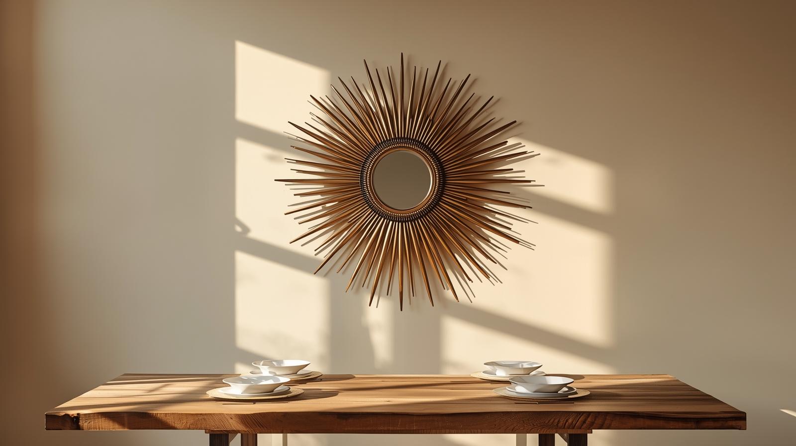 A single starburst mirror needs nothing around it — it is the entire statement. Choose one in antique gold, brushed brass, or matte black and center it on a plain wall above the dining table or sideboard. The radiating rays catch light from every angle throughout the day, creating a dynamic, almost living wall feature that shifts in appearance from morning to evening light.