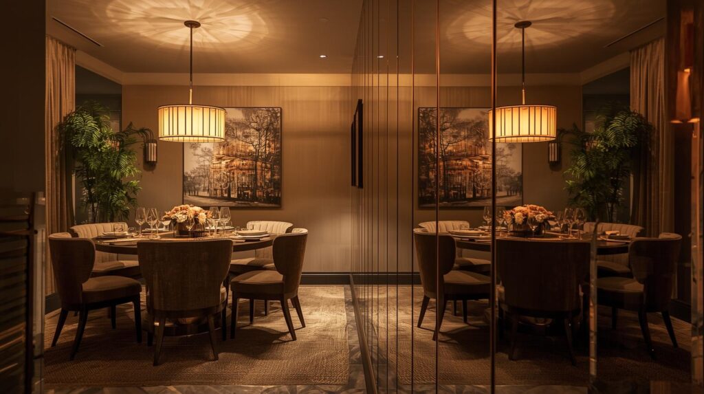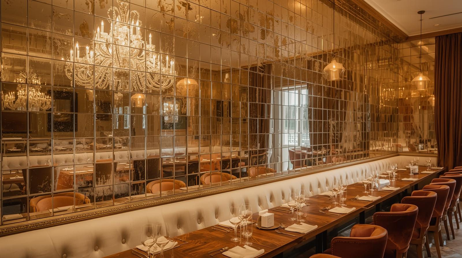 For the boldest possible dining room mirror statement, install one or two full floor-to-ceiling mirror panels on a single wall. This architectural approach completely dissolves the boundary of the room, doubling the perceived space and reflecting the entire dining scene back at itself. It works especially well in narrow dining rooms where the mirrored wall creates an illusion of generous, expansive depth.