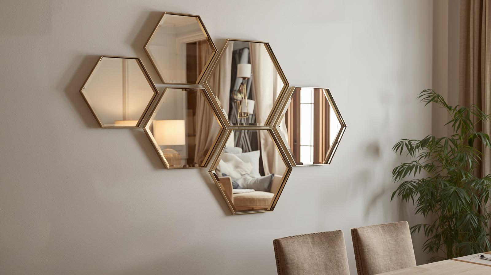 Hexagonal mirrors arranged in a honeycomb or scattered cluster pattern create a geometric wall installation that feels modern, artistic, and completely unexpected in a dining space. Choose mirrors with thin gold or black frames and vary the cluster density — tighter in the center, looser toward the edges. The result is a sculptural wall feature that doubles as functional mirror and contemporary art.