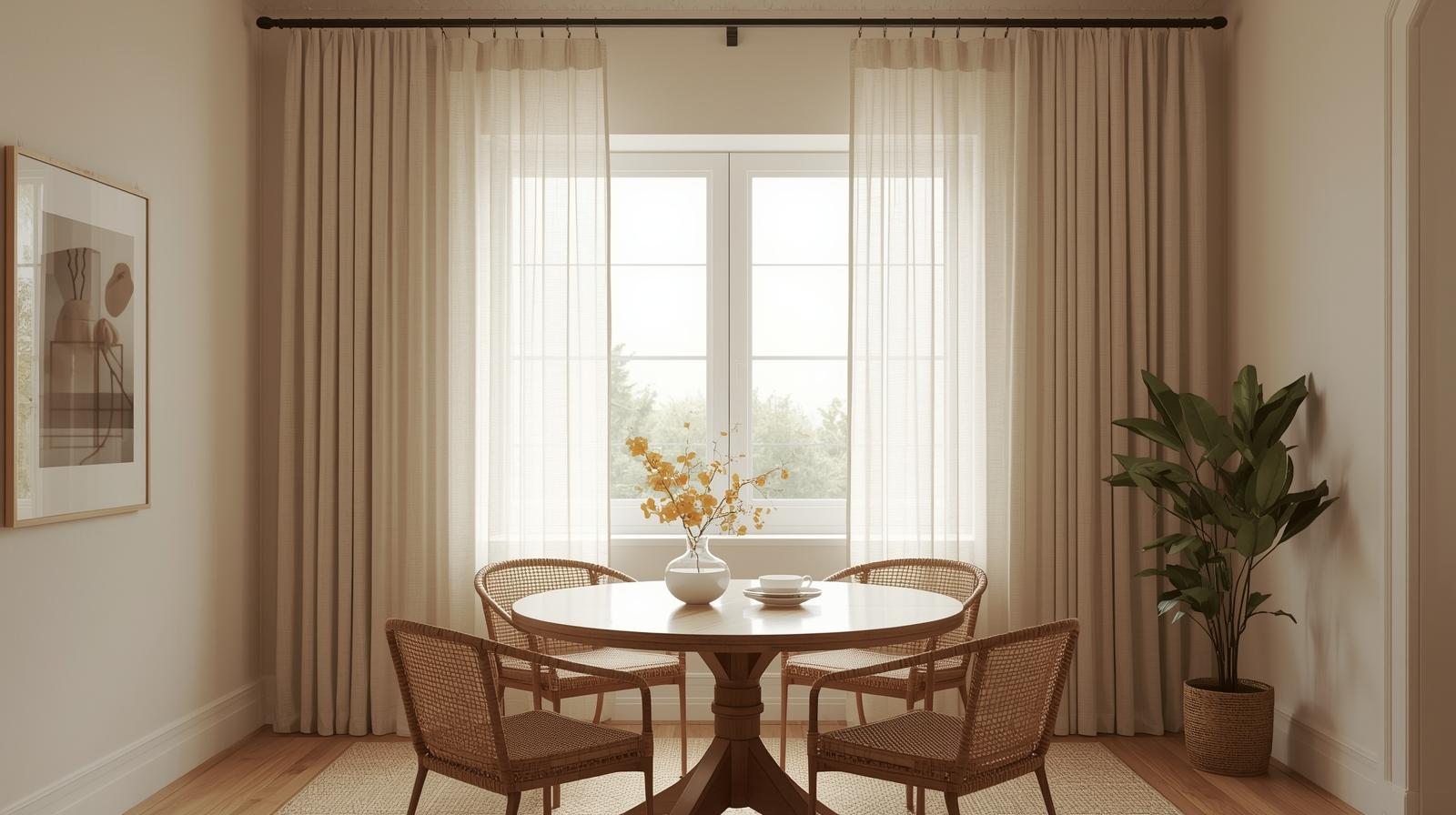 Hanging curtains significantly higher than the window frame and extending the rod well beyond the window width on both sides is one of the most transformative optical illusions available in small space design. It makes windows appear larger, ceilings feel taller, and the entire room more grand and proportioned. Choose sheer linen or lightweight cotton in soft white or warm ivory. The flowing vertical panels frame the dining area beautifully while flooding the room with soft, diffused natural light.