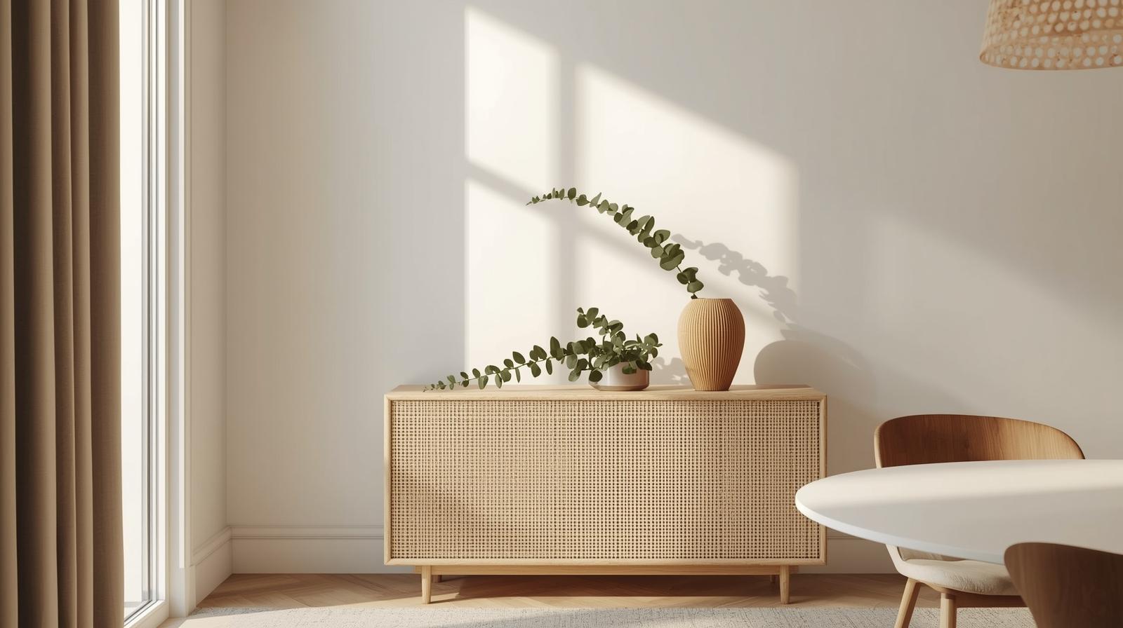 In a tiny dining room, a full-sized sideboard or buffet is simply too bulky. A slim console table offers the same surface functionality at a fraction of the visual weight. Use it to hold serving dishes, a small lamp, or decorative objects. Choose a design in natural cane, light wood, or black metal to keep it feeling lightweight and intentional. Style the surface minimally — one plant, one candle, one object — to avoid the narrow space feeling crowded.