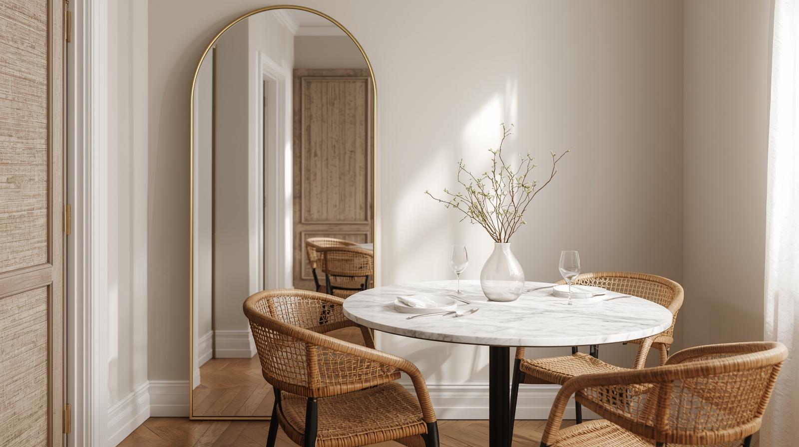 Hanging a large mirror on the main dining room wall is one of the most effective visual tricks for making a small space feel dramatically bigger. It reflects light, duplicates the depth of the room, and adds a sense of grandeur that punches well above the room’s actual square footage. Choose a full-length rectangular or arched mirror in a slim gold or black frame. Position it to reflect the table setting and any natural light source in the room.
