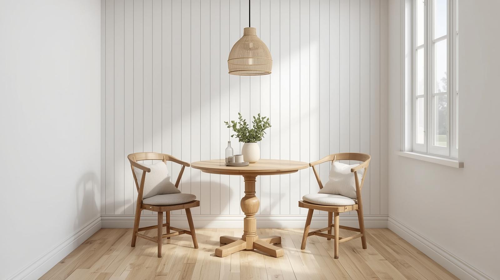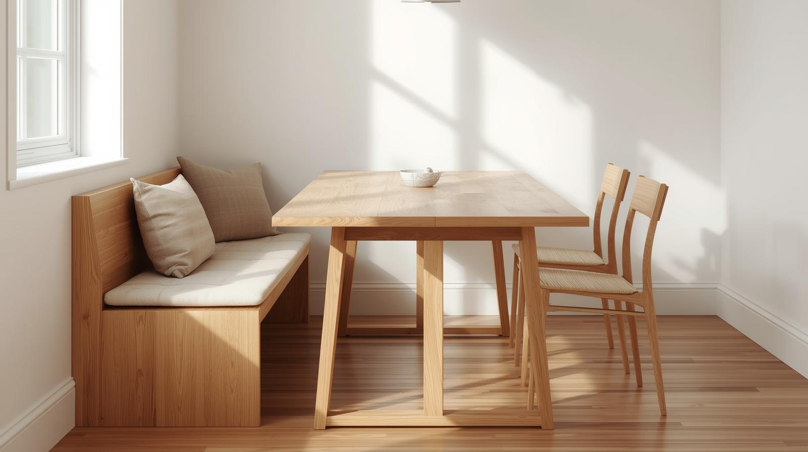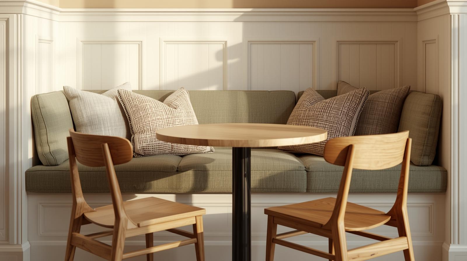 A built-in banquette transforms a tight dining corner into a space-efficient and visually charming seating solution. Tucked flush against the wall, it eliminates the need for chairs on one or two sides, instantly freeing up precious floor space. Add storage drawers beneath the bench seat for bonus functionality. Style it with a mix of cushions and throw pillows in linen or cotton for a cozy, café-inspired atmosphere that feels both designed and practical.